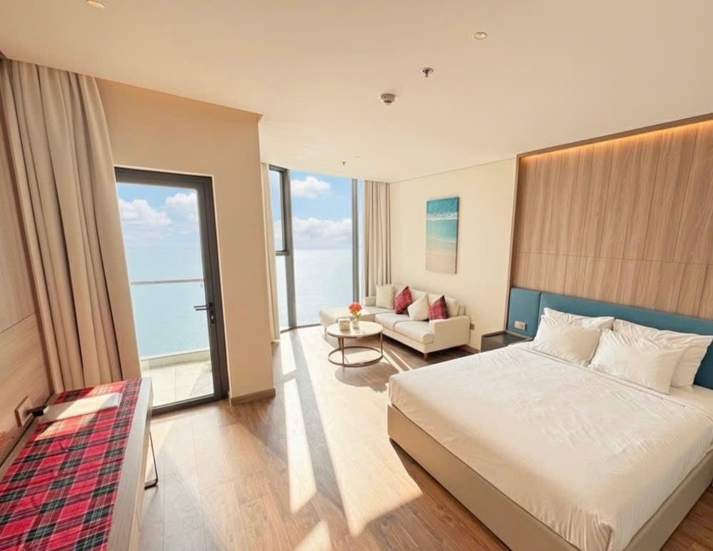 This is a beautiful apartment located in the A La Carte Ha Long building, the tallest building situated right by the beach. An ideal place to relax with a sea view. A productive workspace with a desk, WiFi, and full amenities in the apartment. You can conveniently reach the following locations: • 1-minute walk to the beach. • 5-minute drive to night market. • 10-minute drive to the city center, Quang Ninh Museum .... The room rate does not include breakfast, swimming pool, or gym fees.