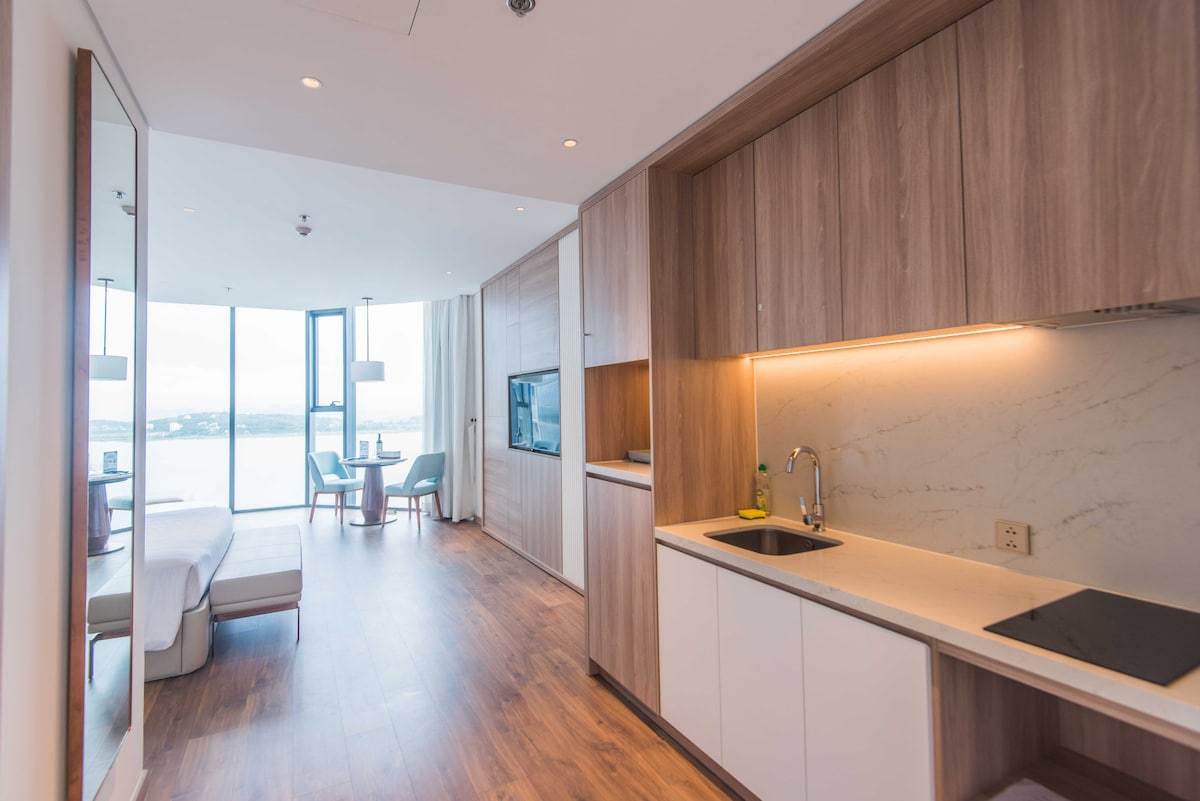 - Điểm nhấn chính là phòng hướng biển nơi bạn có thể nhâm nhi ly cà phê buổi sáng, ngắm bình minh rực rỡ hay thư giãn cùng hoàng hôn lãng mạn trên biển. - Căn hộ gồm 1 phòng ngủ, phòng khách liên thông bếp và thích hợp cho cặp đôi hoặc gia đình nhỏ. Nội thất tiện nghi: điều hòa, wifi tốc độ cao, smart TV, bếp nấu,… mang đến cảm giác thoải mái như ở nhà nhưng vẫn trọn vẹn trải nghiệm nghỉ dưỡng. - Vị trí ngay cạnh bãi biển – chỉ vài phút đi bộ, bạn đã có thể hòa mình vào làn nước trong xanh.