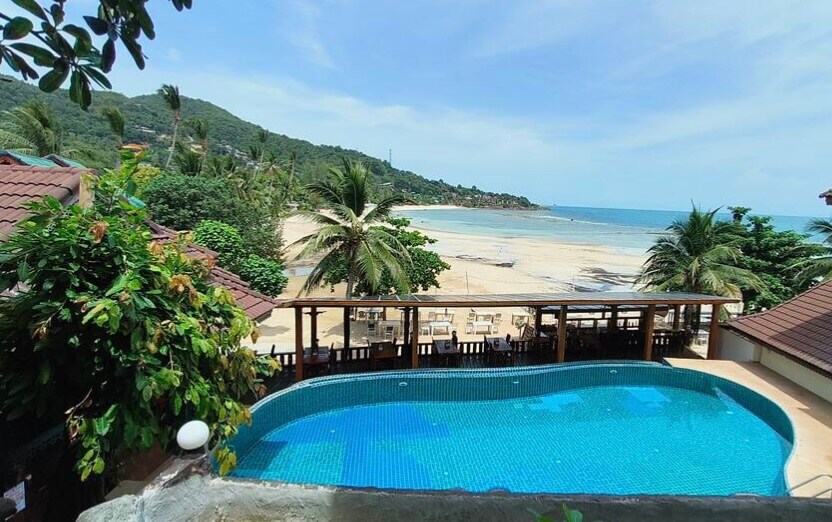 Mountainside spacious king bed studio- serviced apartment Nestled in the treetops directly above the beach-hear the waves lapping! Share the pool, enjoy serene nature.. Shaded balcony offers privacy and sunset views over Koh Samui Location only for the very fit and adventurous- many steep stairs down to the house and the beach Once or twice per week we have some live music/dj/show up till 11pm at our Beach Club- free entry for our residents!