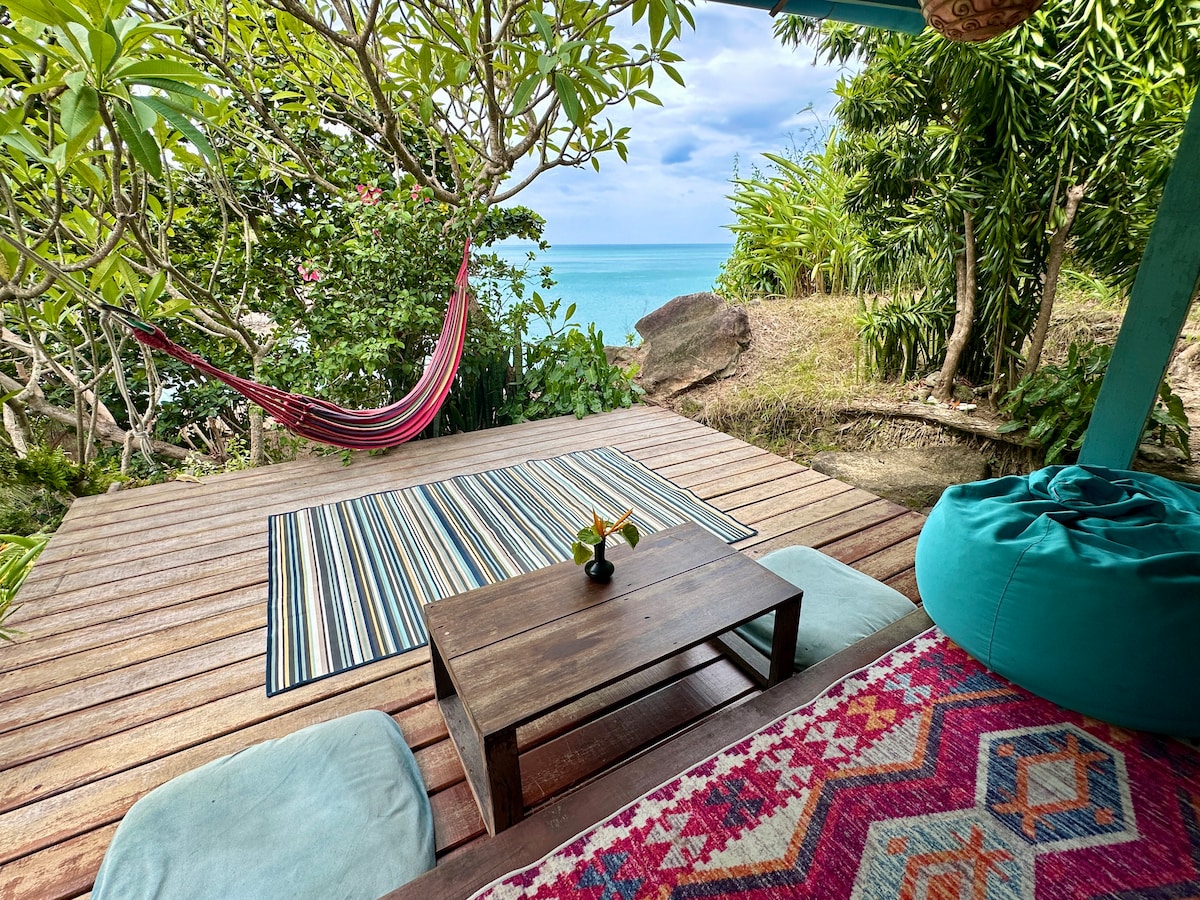 Blue Moon is a cozy and colorful BEACHFRONT bungalow located just steps from the peaceful bay of Chaloklum, the local village and cultural hotspot of Koh Phangan. Wake up to sweeping views of a CRYSTAL CLEAR BAY framed by palm tree covered slopes. Splash around in the calm shallow shores, perfect for kids. And watch the sky change colors at sunset from your hammock. HIGH SPEED WIFI and SMART TV add even more options for a perfect stay.