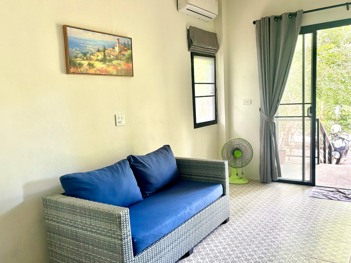 45 m²🏡 with sofa bed, hot water, cozy balcony, AC and wi-fi. In the❤️of Koh Phangan, only 2 mins drive from the beach, 5 mins from the center. ⭐Fully stocked and equipped kitchen⭐ Very safe area that you can leave the door open anytime. "Excellent place!!! Has everything you need (including a stocked kitchen with basic equipment). Really clean, well-designed space. AC, hot shower, hammock! Overall, I loved my stay here and hope to return. Oh, and book a Brillo massage...fantastic!"