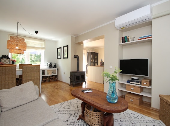 Enjoy extras: hot tube (€39), sauna (€30), cocktail bar, hookah (€20), hanging tents for unique sleeping experience (€15) caravan for trips, and fresh seasonal garden products. The cozy cabin sleeps 4 (double bed 120 cm+ sofa bed), extra mattress for 5th guest. Kitchenette includes cooking essentials, coffee, and spices. Fireplace and air heat pump (AC) for extra comfort.