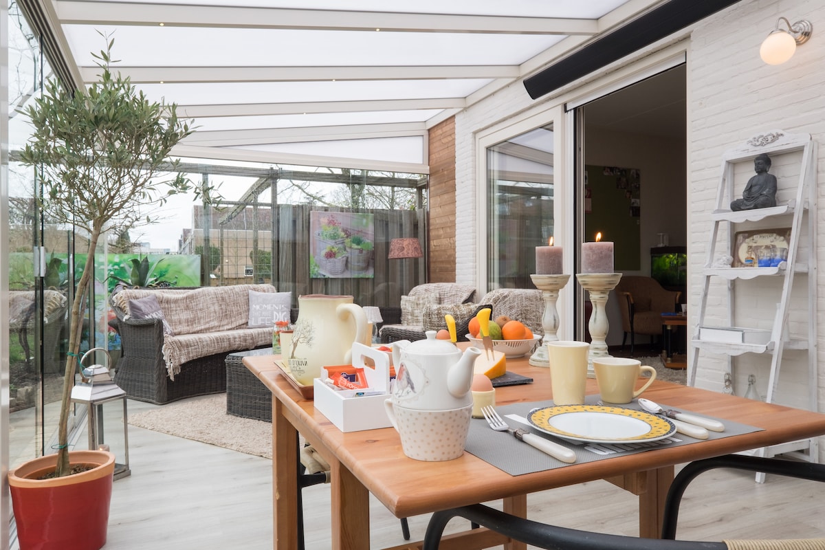 Our sunny garden chalet is freely situated in our 400 spuare metre-large garden behind the house. The chalet has sliding doors to the garden, a pull out sofa bed (double), an open kitchen, underfloor heating and a wood stove. Enjoy the peace on your own sunny terrace among the flowers and plants! Located in the heart of the flower bulb area near the coast, within 7 minutes walking distance to the train station.