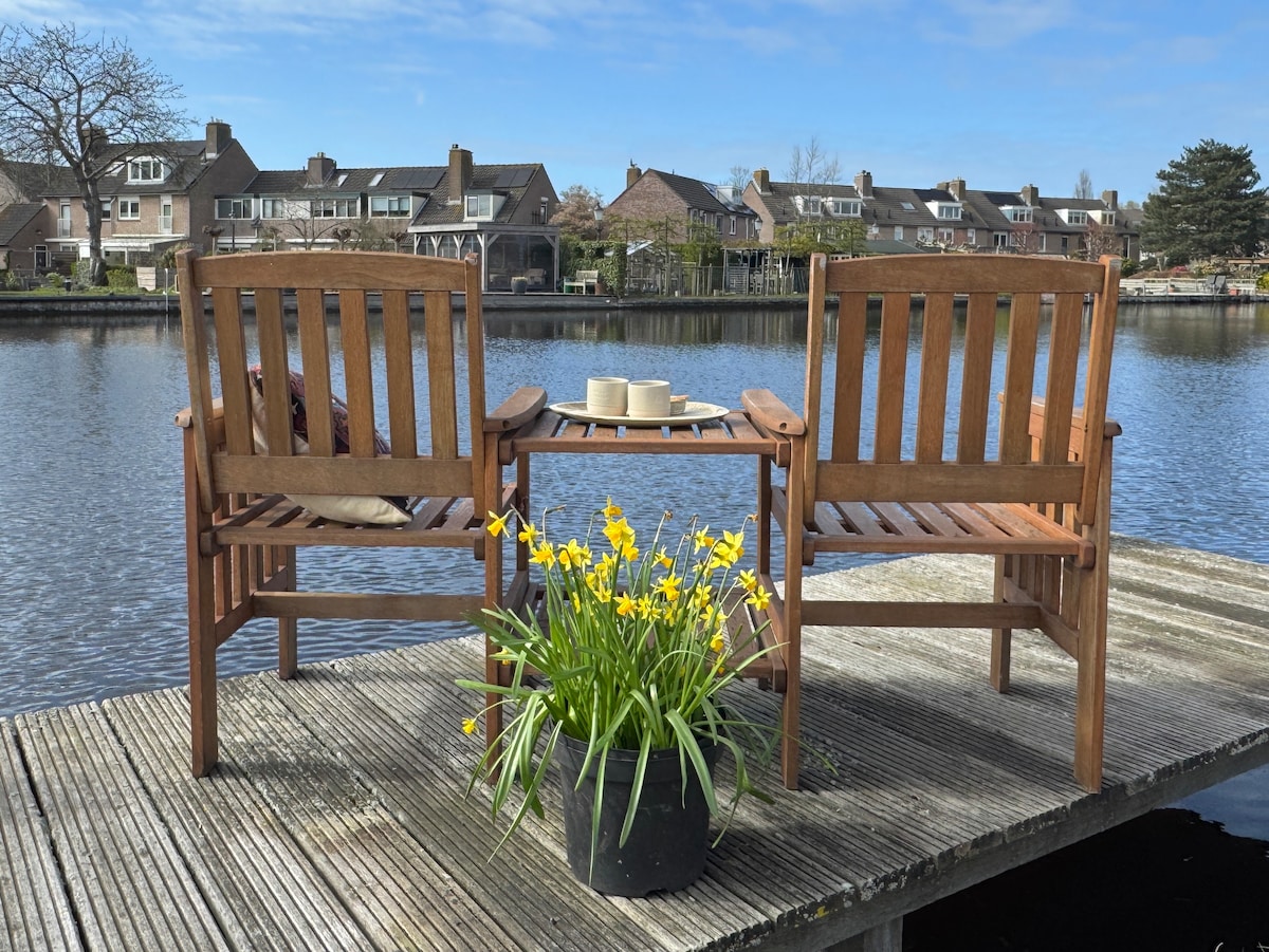 Wake up by the water, with morning sun in the garden and views of the private jetty. This bright dike house with natural materials is near Keukenhof and perfect for cycling through tulip fields and trips to Amsterdam. The open layout and French doors connect inside and outside, with direct access to the terrace. A calm place with comfort and privacy to return to after a day out. Two e-bikes are available (optional) to explore the fields and dunes.