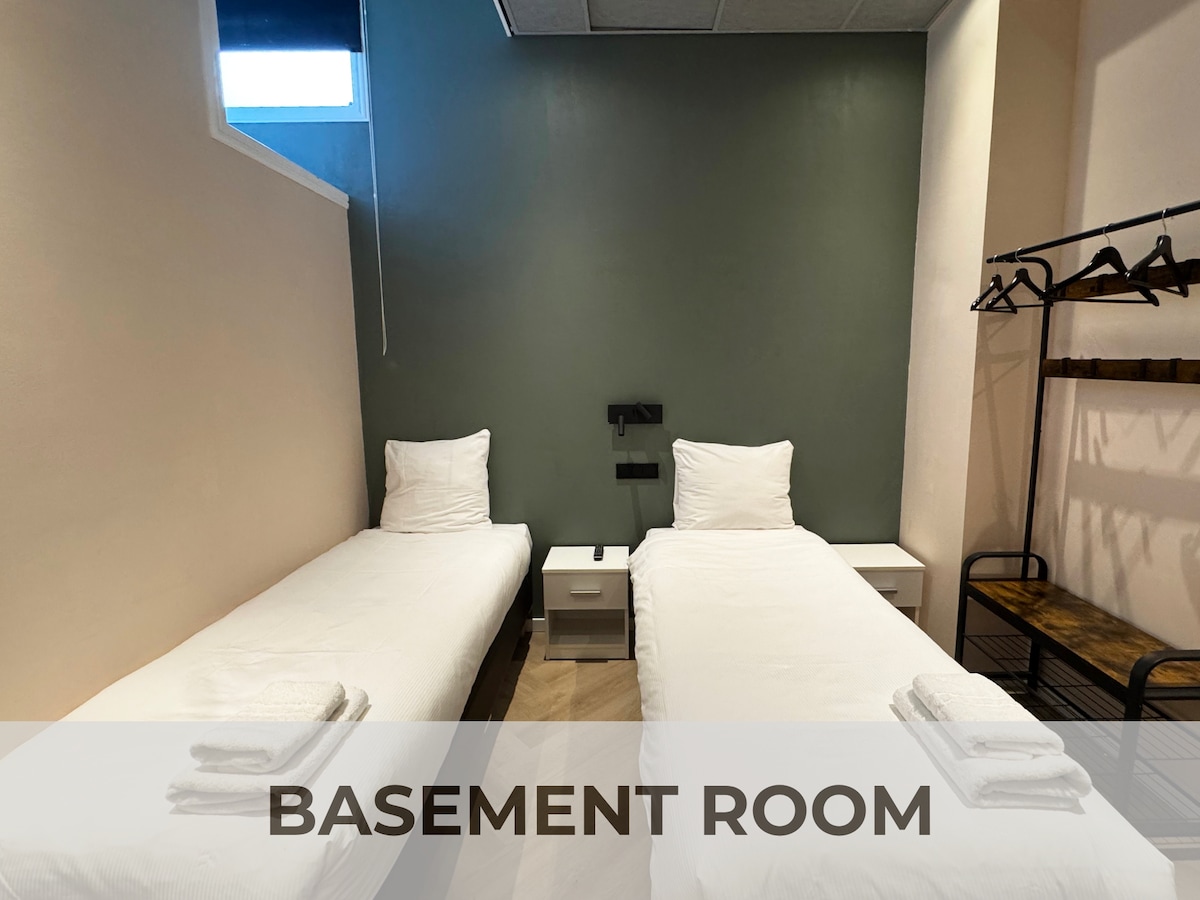 Our Souterrain Budget Twin Room offers practical comfort for up to two guests, with twin beds, an ensuite shower bathroom, hair dryer, and wardrobe. Though windowless, it feels cozy thanks to thoughtful amenities—kettle, flatscreen TV, and access to a shared lobby with complimentary coffee and tea. Ideal for both business and leisure, it also offers shared cooking facilities on request, plus a separate living area. A simple yet comfortable stay at excellent value.