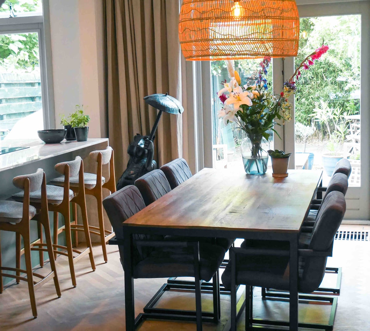 Classic Dutch home, practical, big & beautiful. (🙏Note: Original Airbnb model where guests are guests, not customers. This is our home!) Ideal for extended families. Large, quiet garden in the back with three patio's catching the sun at different times of the day. 5 bedroom, 2.5 bath. Sleeps 9. Bus stop in front of house. Near beach, shops, Haarlem and Amsterdam. 6 Bikes for guests. 25min by bike to Formula 1 and beach. Parking for 4 cars. For reviews & more photos see our two bedroom listing.