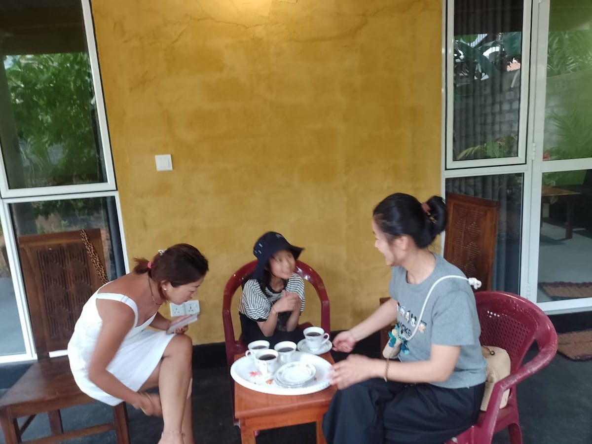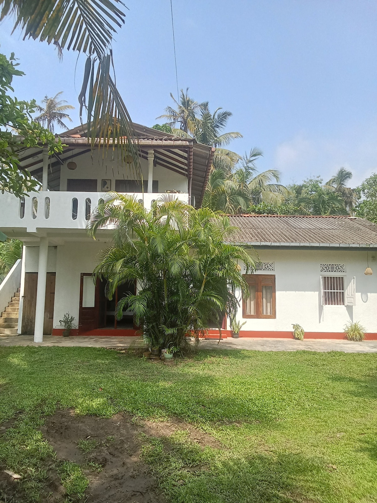 Relax with the whole family at this peaceful place to stay. Fully furnished villa with four spacious air conditioned and private balcony having bedrooms. Two bathrooms are attached, and one common with hot water. Two living areas, fully equipped open kitchen and spacious roof top. The supermarket is 200m away and public transport 75m away. To Polhena beach 600m, Madiha surfing spot 1km, Waligama tourism town 8km, Mirissa tourism area 5km.