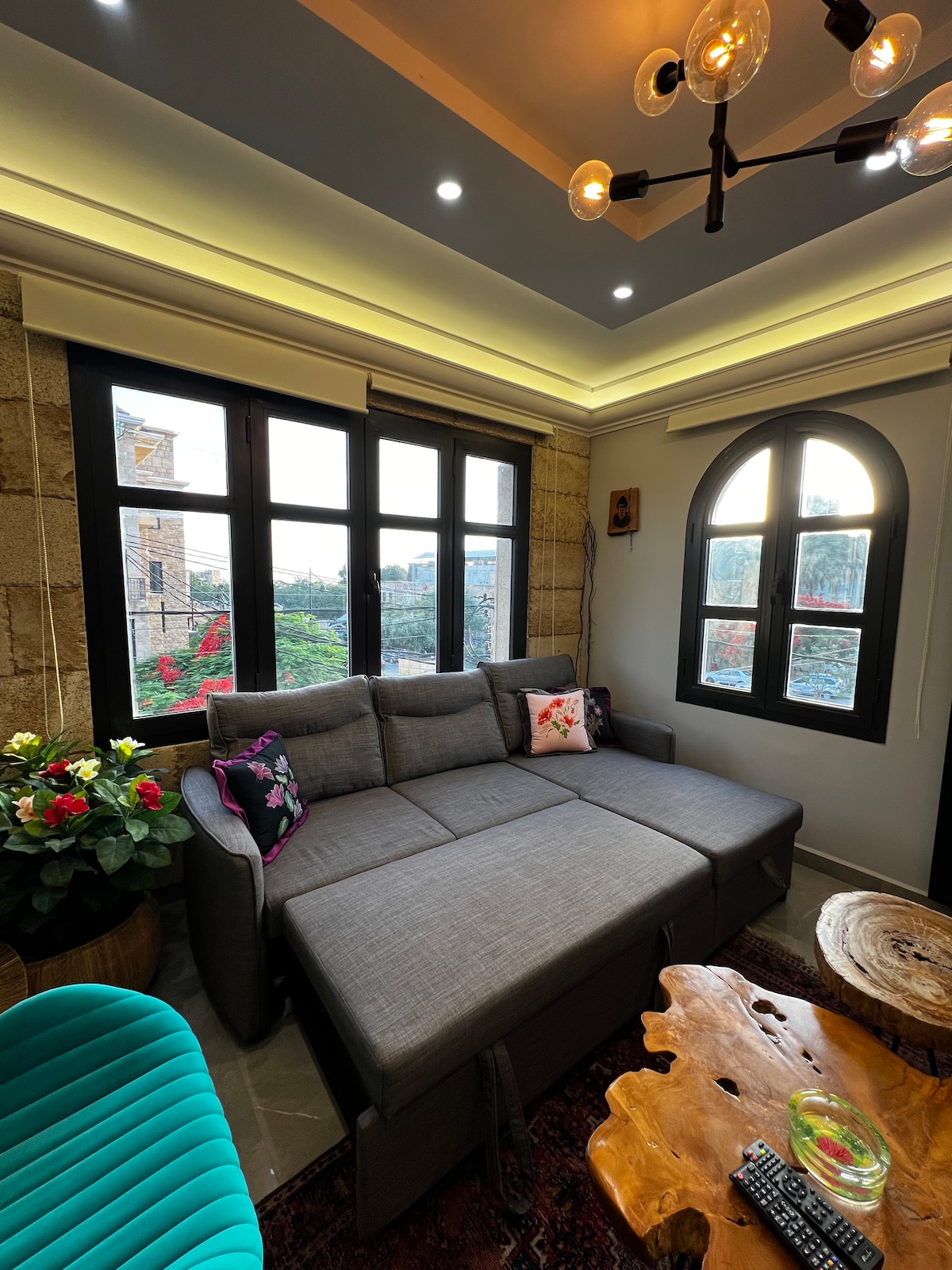 Enjoy a sunny living place with a green front yard and a fireplace. Located in the heart of Byblos overlooking garden and greeneries, in a very calm residential and safe area. The apartment is modern style, decorated and well maintained, it is a 5 min walk to Edde sands, central old town/souks, restaurants and main archeological sites. It is the perfect getaway to connect with nature and relax while still living in the city and near the beach. This place is suitable for couples and small family