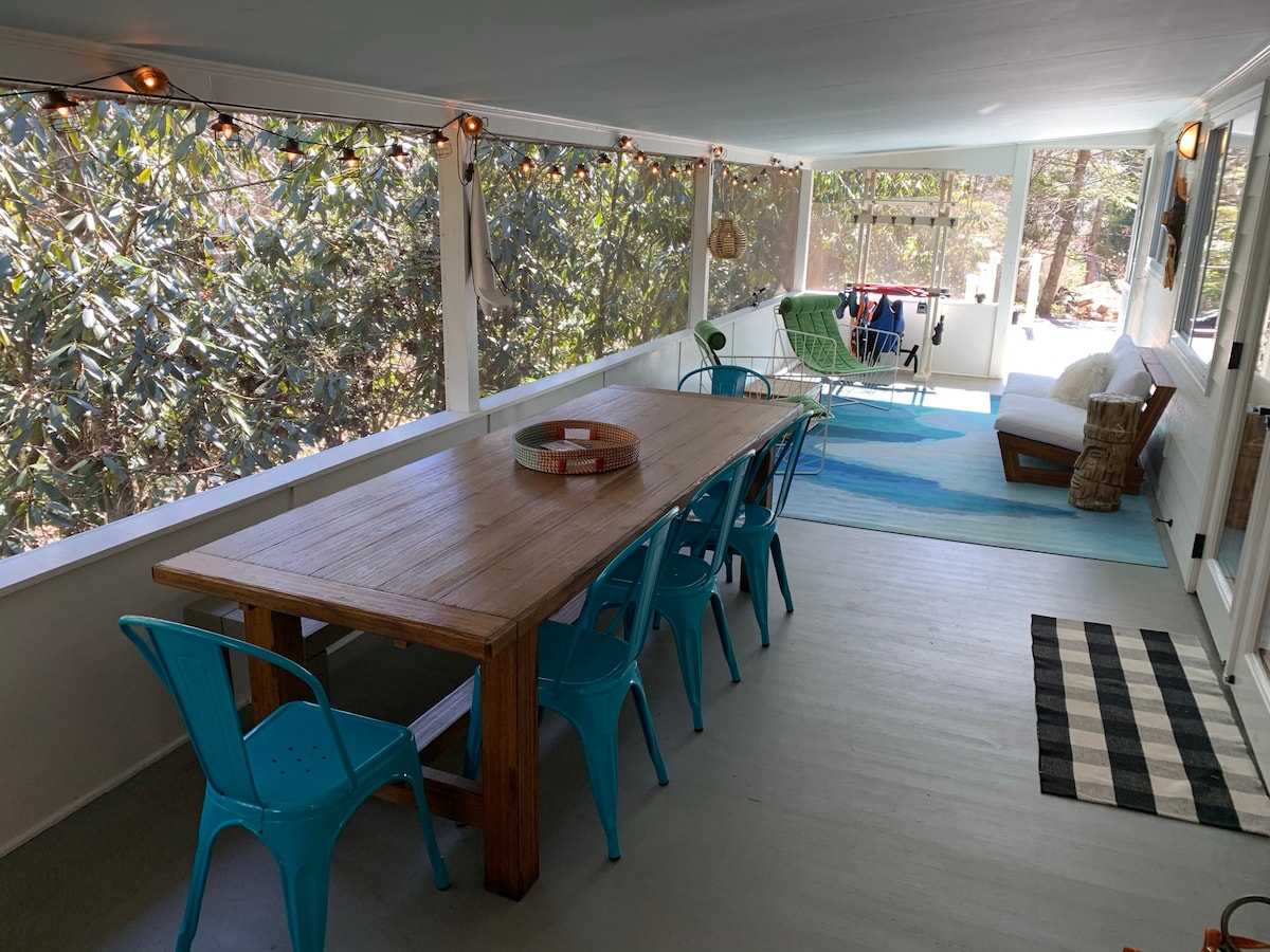 Newly renovated lake home with open design that combine the great room, eating area, kitchen, and a the gathering area. Two sets of French doors open to a high ceiling screened porch. A deck area connects the porch. The lake home is located 0.5 mi to the 96-year old Lake Rabun Hotel, Louis on the Lake, and Hall's boat house. Relax with nature. Residence sits on a quiet lane. Parking space for 2 cars.