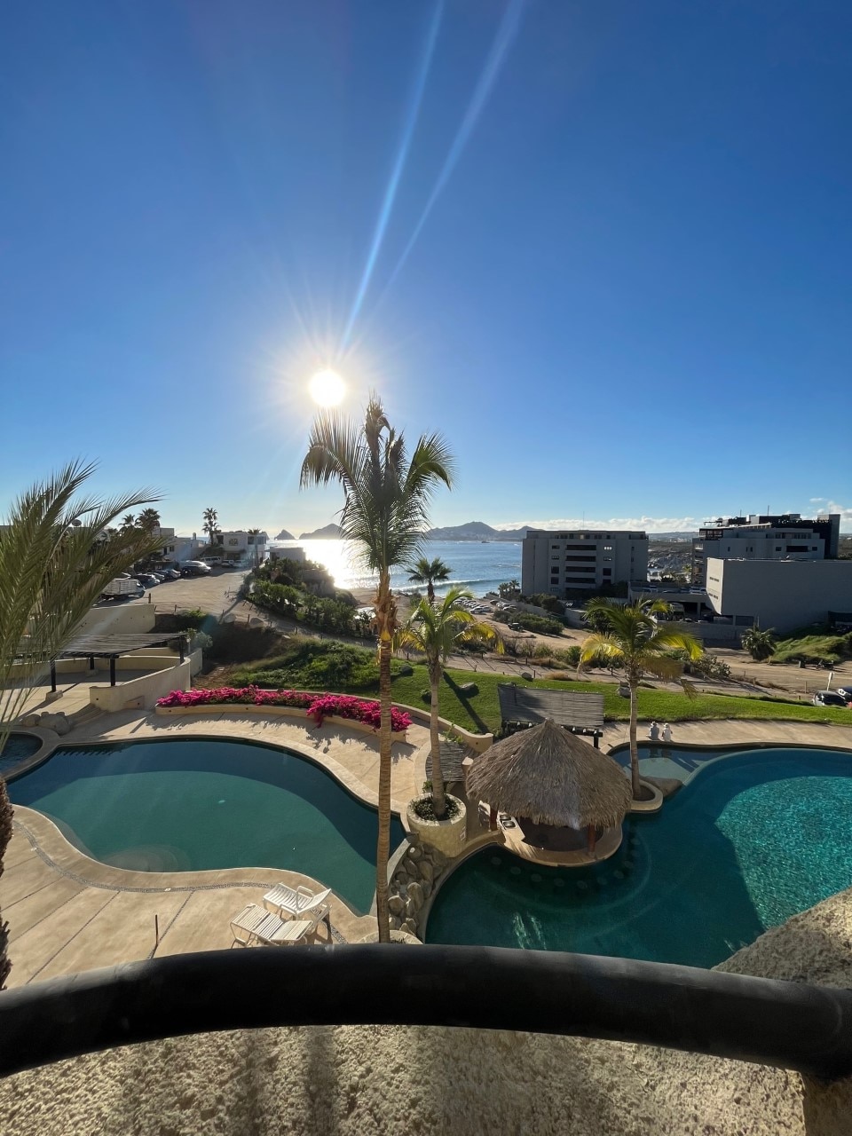 The condo's 180º view lets you enjoy sunrise and sunset at the Cabo Arch from your breakfast-dinner table! Terrace design offers intimacy and escape. Ideal for a romantic stay, home office with paradise views, BBQ dinners with sunset vistas, relaxing hammock siestas, whale-watching while cooking, and sunrise views from bed! Walking access to Cabo's top two beaches and next to The Cape and Thompson Hotel. Please remember, this is a rental condo, not a hotel, and the price reflects that.
