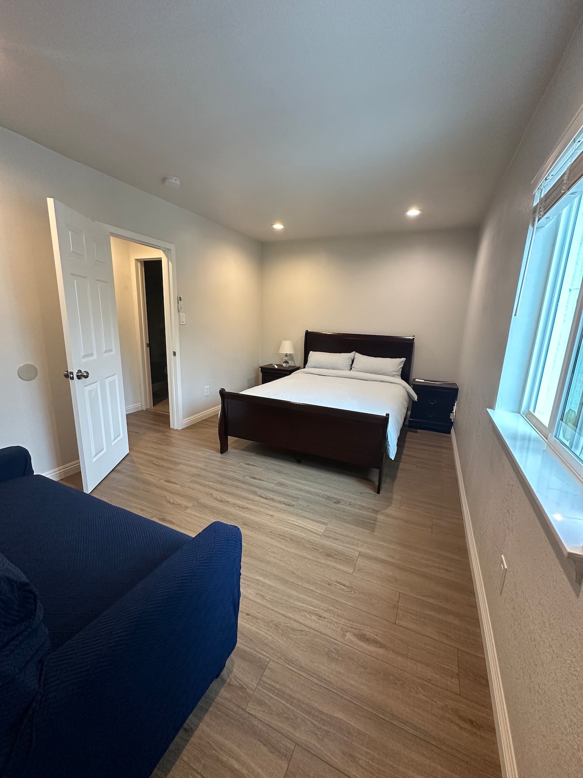 Quiet and cozy standalone guesthouse with private entrance and self check-in. No contact with other guests, no spaces are shared — everything is entirely for your private use. Features a queen-size bed ideal for couples, an additional sofa bed can be provided for the third guest to sleep on. A/C and heating, work desk, fan, and smoke detector. Enjoy a private kitchen for light cooking, a walk-in shower, and blackout curtains for restful sleep. Large windows provide plenty of natural light.