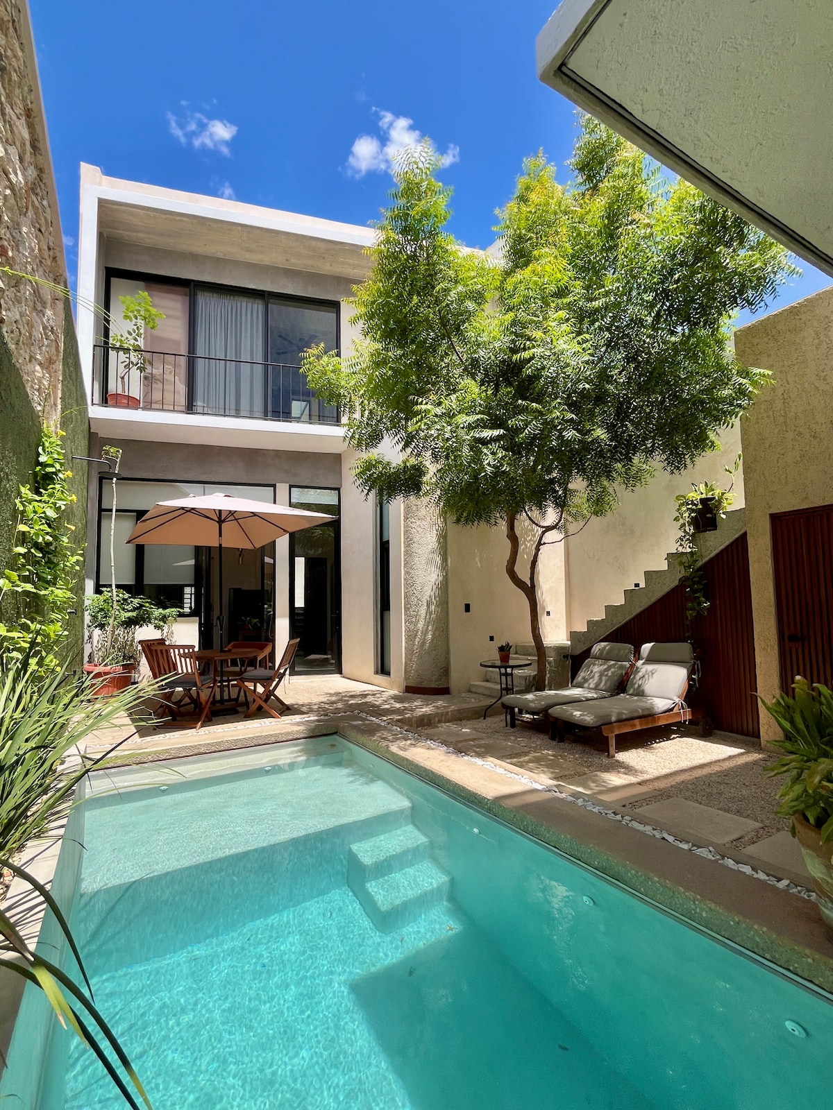 Spacious apartment inside colonial house, perfect for 2. Located east of downtown Mérida, near the ChemBech neighborhood, only a 20-minute walk from the main square. It welcomes travelers seeking calm and introspection. Unique in style and design, with luxury finishes, it guarantees privacy away from the hustle downtown. The apartment is completely private, on the lower level. It has a fully equipped kitchen and living room, a pool, a garden, a terrace, one king bedroom with a marble bathroom.