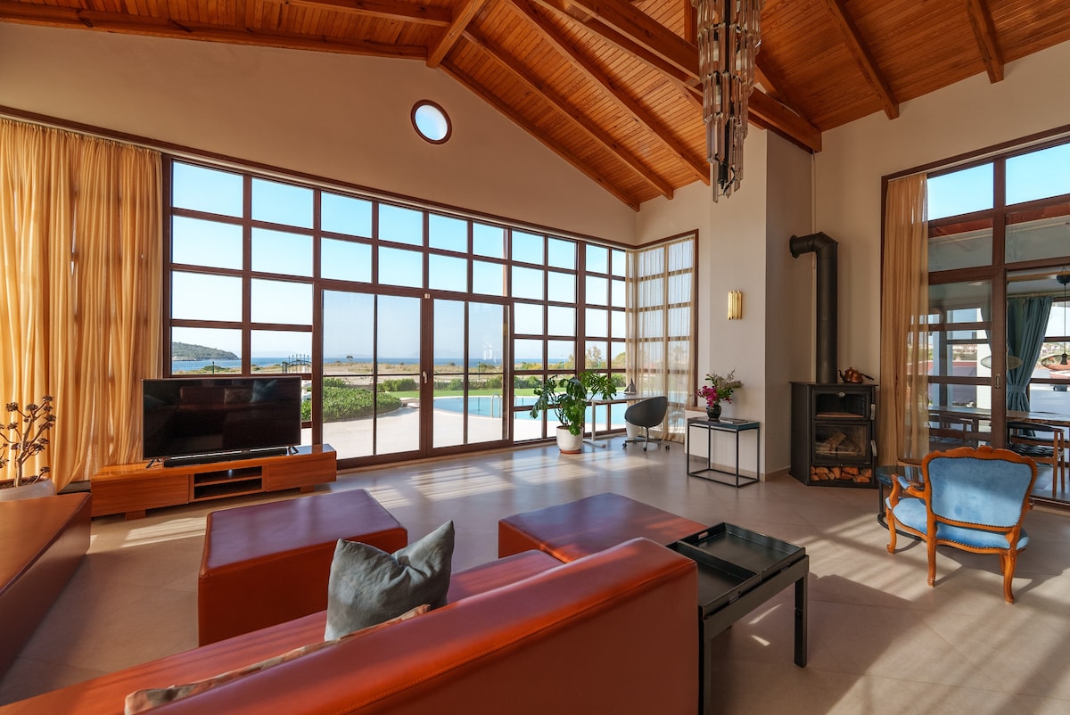 Seafront!Breathtaking panoramic views of the AegeanSea. Large swimming pool&water fountain. Patio with a traditional wood fired brick oven as well as a Weber Summit BBQ.Plenty of sitting/dining/cooking/counter space. 7KW Solar Energy(no more outages!) !Gigabit! FiberInternet! 5 bedrooms, 5 full bathrooms, a fully equipped kitchen, veranda, Huge living area with cathedral ceilings. Ilıca Beach 6min,Alacati 10min,4mins toHotSpring Great home for families and friends looking for a relaxing holiday.