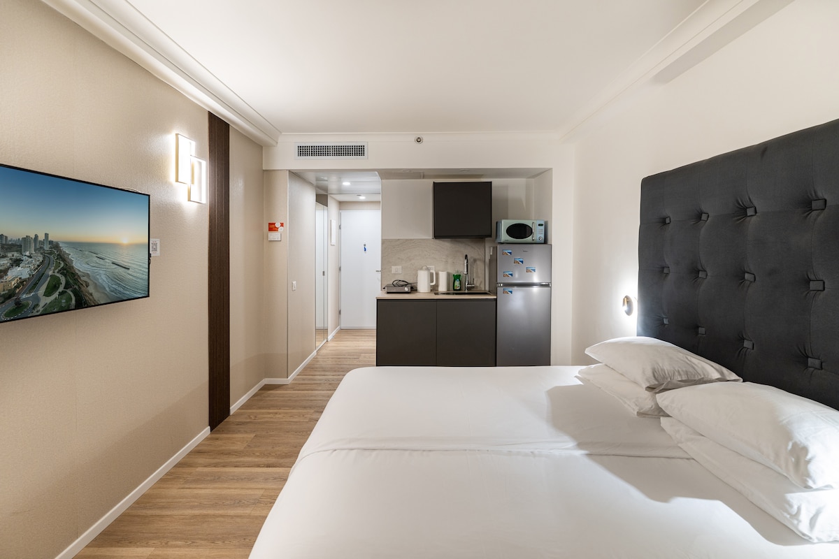 The studio is located in the Sharon Hotel at the most beautiful position in Herzliya seaside strip. The new refurbishment and furnishing are to the highest standard. Stepping out to the balcony one can enjoy spectacular views to the sea with Tel-Aviv and Jaffa in the distance. The guests can walk down to the beach or use the hotel's swimming pool (paid separately to the Hotel at the front desk) .Below the hotel you'll find: restaurants, cafes, bars, supermarket, hairdresser and more.