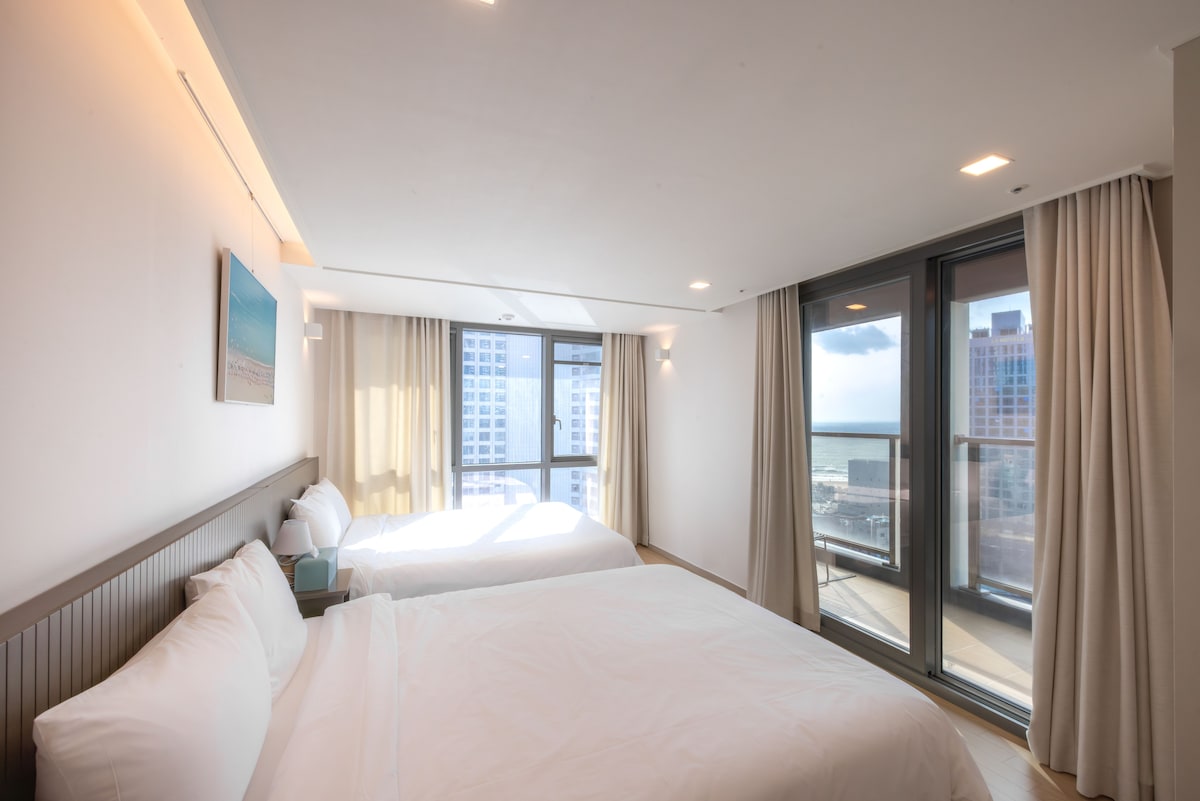 1등숙소/광안대교풀오션뷰+해운대씨티뷰/3룸(넓은침실2개+거실)/퀸침대3/무료주차/5성호텔급