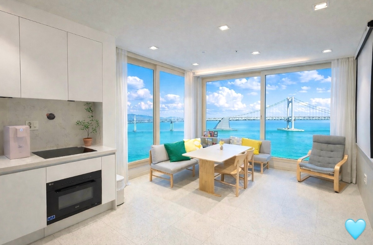 #. This is a legal accommodation officially registered as a foreign tourist city homestay business. ♣ Full ocean view with the entire Gwangan Bridge ♣ Free parking ♣ Non face-to-face check-in (3:00 PM) ♣ Store luggage before check-in (please inquire in advance) ♣ Host manage room conditions and respond to guest ◈ Gwangalli Beach - 3 min walk ◈ Millac the Market - 1 min walk ◈ BEXCO & Busan Cinema Center & Shinsegae Dep. - 7 min by car ◈ Haeundae - 15 min by car ◈ Gwangan Station - 20 min walk