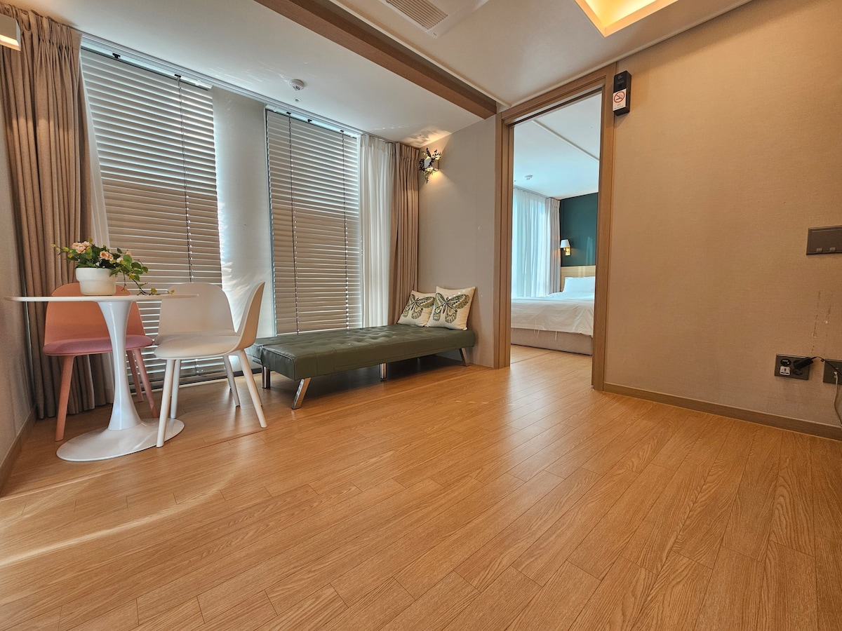 Welcome to your stay in Busan. Our apartment sits in lively Gwangalli yet offers a quiet oceanside retreat. Every room—dining, living, and bedroom—has views of Gwangan Bridge. Step outside to a seaside running path, and enjoy free use of the fitness center plus a paid sauna. With the beach, cafés, and attractions nearby, the space blends relaxation and convenience. 𖠁 Note: Sofa bed bedding is included for 3+ guests or can be added for ₩20,000. 𖠁