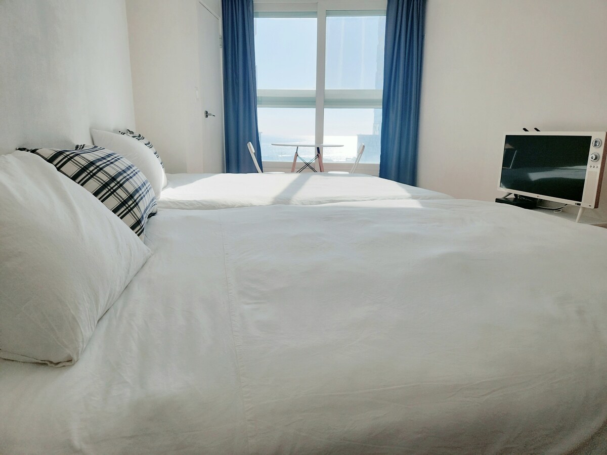 ★ 킹침대 1 +킹침대 1 (대형침대) 침구모두 순면100% ★ 틈새로 바다가 보임. ★ 집앞 2분 바로 바닷가! ★ 상시 호스트와 연락 가능 ★ 잠자리 위주의 숙소 ☞ 주차안내 해당건물주차 : 무료(미리 말씀해주세요) 전기차 시설 ★ 입실ㅡ오후 5시 (짐보관 가능) 퇴실ㅡ오후12시 ★숙소 에티켓~* - 매운탕. 갑각류 삼겹살등 냄새나는 음식금지 조리불가 - 침구류등 세척으로 안지워지는 오염주의 - 사용하신 식기는 설거지 부탁드려요 - 절대 금연입니다. - 폭죽, 부탄가스, 양초등 화재위험 있는것 금지 - 파티, 유리에 풍선붙이기 안되요. *숙소는 예약된 인원만 이용가능하며 예약시에 인원을 정확히 명시해주세요. * 만 24개월 부터는 추가인원 요금 설정을 해주셔야합니다. * 미성년자 게스트께서는 보호자동반으로만 예약가능