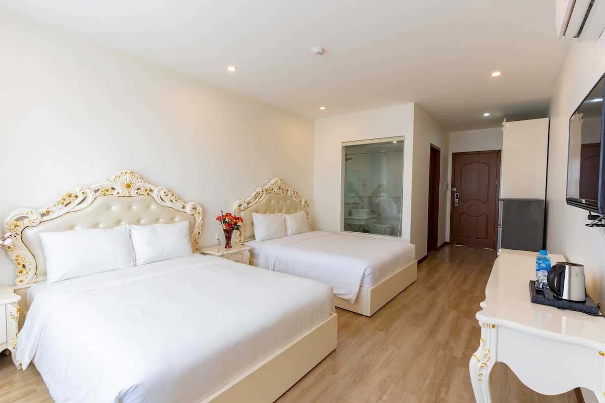 Grand Hill apartment & Hotel has 90 rooms around 30 - 38 m2/ room, some with kitchen or/ and 02 king beds located at Van Cao street in Hai Phong center, Vietnam where there are many restaurants, karaoke, mini bar, markets, shops, coffee, street foods.... and there are many Korean, Japanese citizens & other foreigners living and Creating a fun, bustling, standard, easy traffic, affordable life.