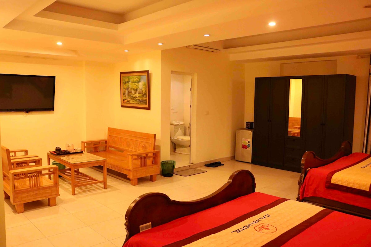 This resort style room is inside Le Grand Hanoi Hotel which is located in a peaceful part of the city, surrounded by locals & very close to Hanoi Opera House & the Old Quarter (less than 1km). Our policy is to serve our guests warmheartedly to the best of our possibilities to make our guests' stay memorable & meaningful. This room is 35m2 wide, has 2 bathrooms, 1 King size bed, 1 sofa, 2 TVs (it's actually 2 rooms separately but connected by the door between the 2 rooms), suitable for 3 people