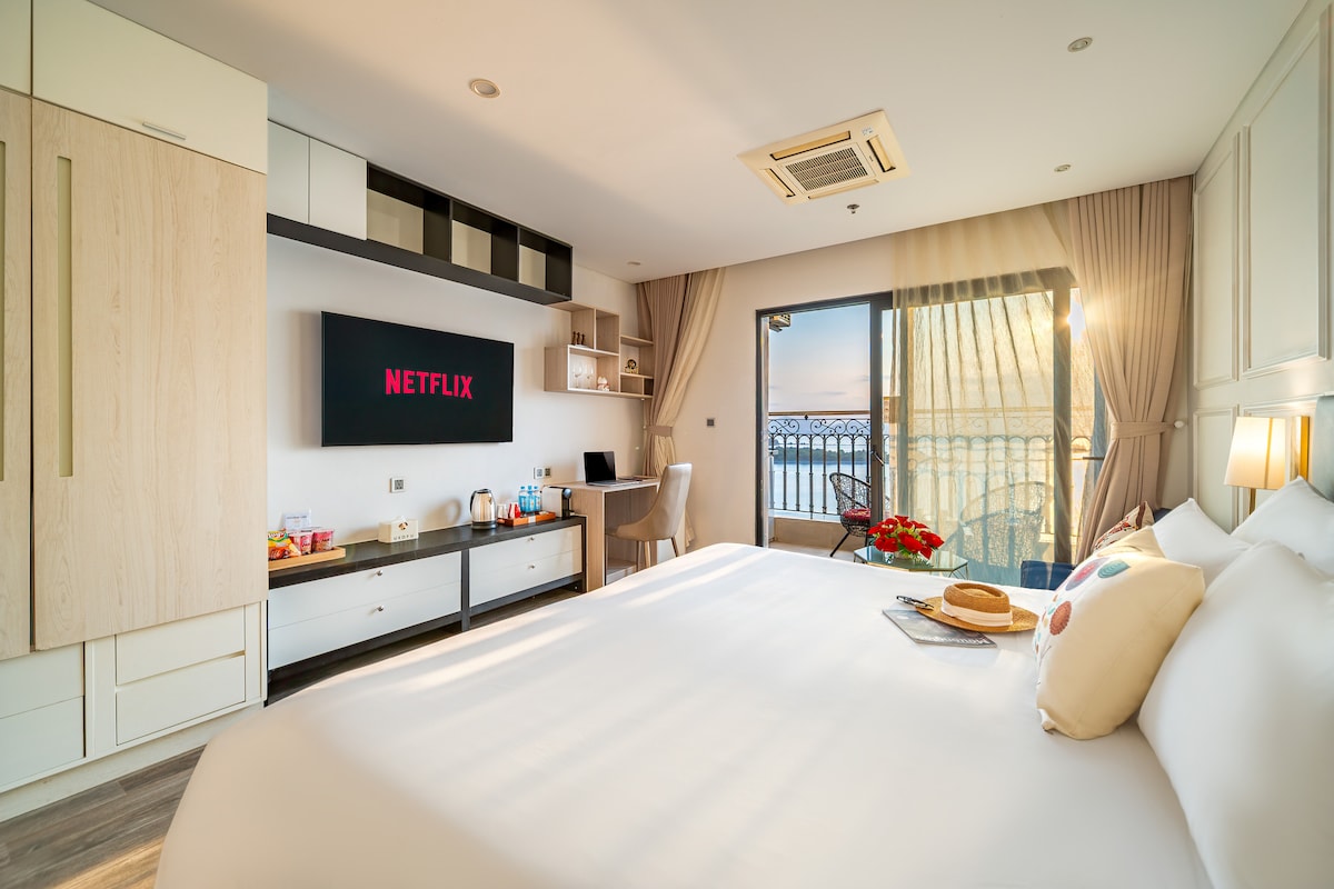 Overlooking the Han River and Da Nang’s iconic bridges, this spacious 110m² apartment offers a peaceful retreat above the city. Located on lively Bạch Đằng Street, opposite the river and just a short walk from Han Market, guests can enjoy Dragon Bridge’s fire show at 9PM on weekends from their own balcony. Designed in deep navy tones with warm wood finishes, the home feels calm, refined. Daily housekeeping, free pool, gym, table tennis make it ideal for families, business travelers, long stays.