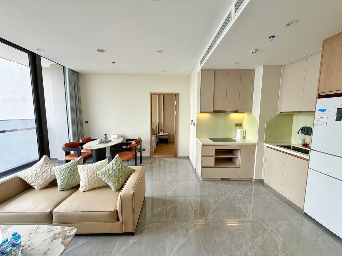 - Điểm nhấn chính là phòng hướng biển nơi bạn có thể nhâm nhi ly cà phê buổi sáng, ngắm bình minh rực rỡ hay thư giãn cùng hoàng hôn lãng mạn trên biển. - Căn hộ gồm 1 phòng ngủ, phòng khách liên thông bếp và thích hợp cho cặp đôi hoặc gia đình nhỏ. Nội thất tiện nghi: điều hòa, wifi tốc độ cao, smart TV, bếp nấu,… mang đến cảm giác thoải mái như ở nhà nhưng vẫn trọn vẹn trải nghiệm nghỉ dưỡng. - Vị trí ngay cạnh bãi biển – chỉ vài phút đi bộ, bạn đã có thể hòa mình vào làn nước trong xanh.