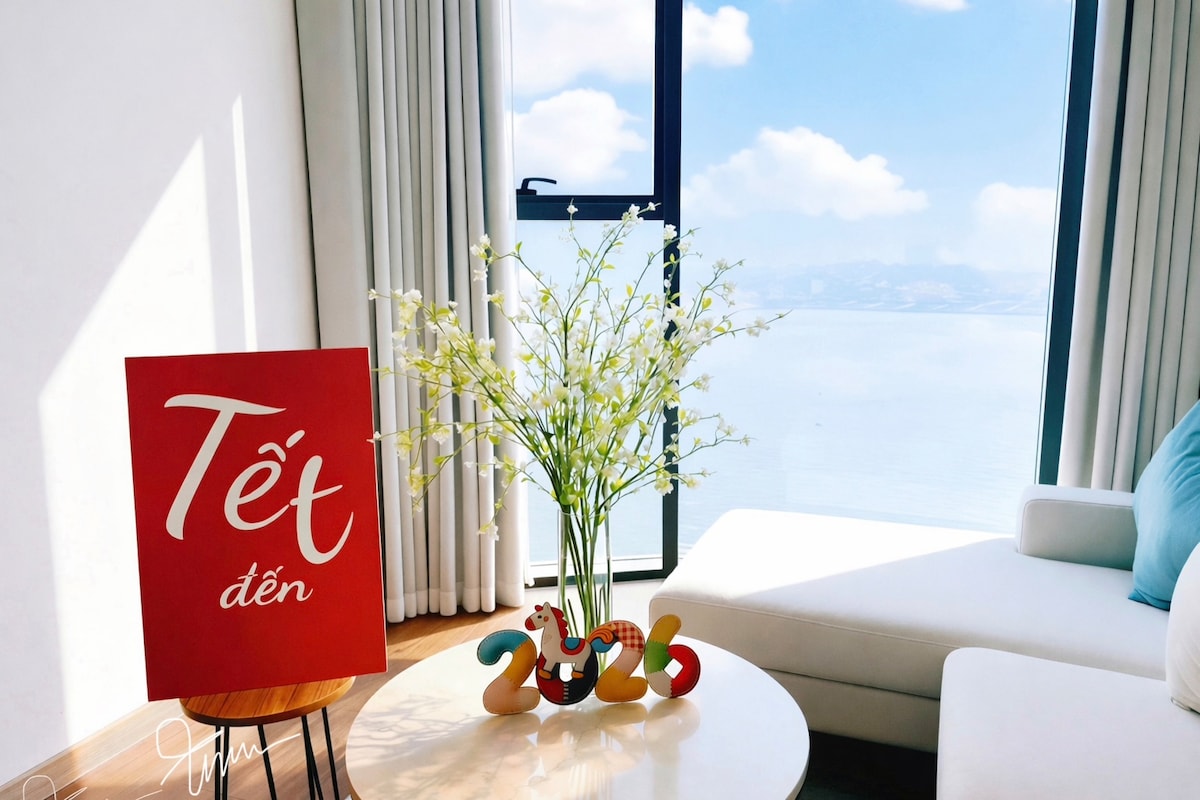 Experience Ha Long Bay's beauty from the 25th floor. Enjoy the cool breeze all day through large South-facing windows. This apartment has modern furniture, kitchen, bathroom, a queen size, and a large wooden bed for Japanese tea sets. This can be converted into a sleeping bed, allowing 2 more people to sleep. The living room has a 48 in. HD TV, internet, air conditioner, fan, wardrobe, washing machine, microwave, rice cooker, kettle, dishes. The bathroom has hot water and full amenities.