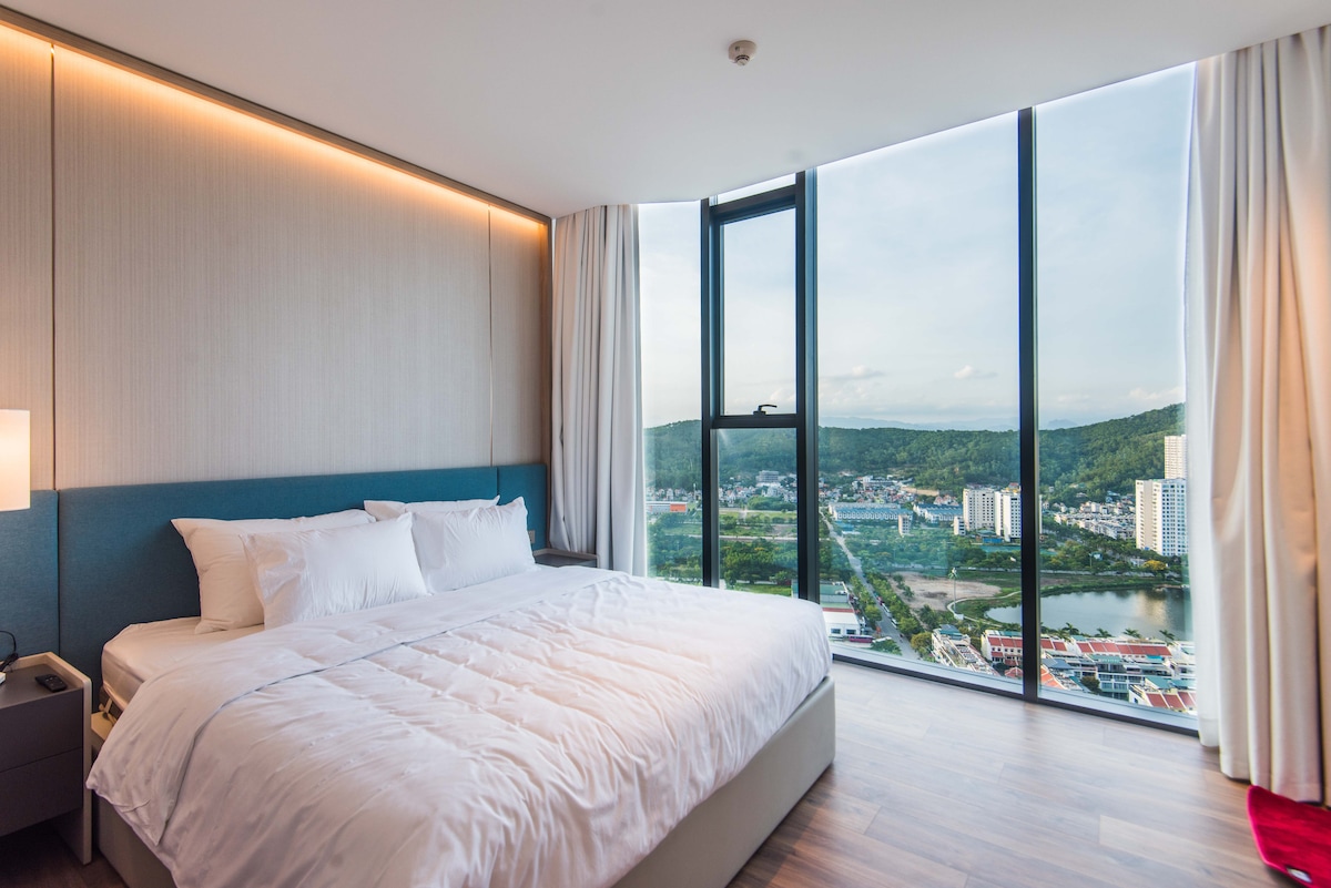 Luxury apartment à la carte Ha Long - the highest 41 floor building in Ha Long, the apartment on the 32nd floor has 2 bedrooms and a living room with glass ocean views, at the foot of the building is a white sand beach, 5-stars standard room facilities are fragrant and clean, suitable for families with young children or groups of friends who want to have a common space when traveling but still need a private, closed bedroom, especially when traveling. Watch the sea 24/24 even lying on your bed