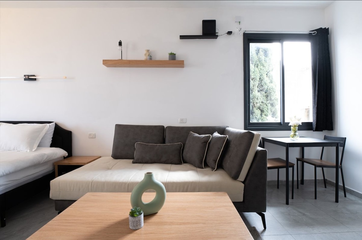 An amazing boutique suite by CASA CARMEL. Newly renovated, romantic and family friendly. Garden and terrace with a breathtaking view of the Carmel Mountains. Fully equipped with everything needed for a perfect stay. Located in an upscale and quiet neighborhood, with so many attractions nearby including hiking trails, cable car, view points, zoo, shopping centers, cafes & restaurants etc. Supermarket & gym at walking distance. Private shelter (MAMAD) available. מכבדים שובר נופש מילואים