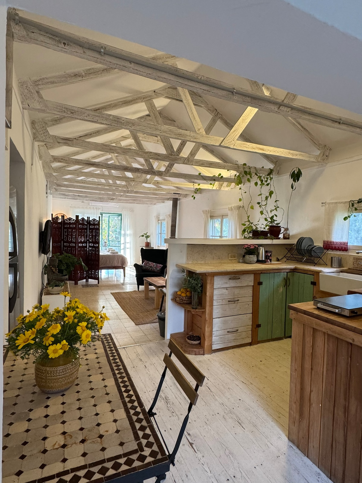 Unwind in this chic 4th-floor apt (walk-up) with country-modern style. Steps from Haifa's Baha'i Gardens (UNESCO site!), it offers comfort & location. Relax in the light-filled living area, cook in the kitchen, or unwind in the hot tub after exploring. The bedroom provides a peaceful escape. Haifa's culture awaits! Explore the Gardens, savor cafes, or delve into heritage centers. Mingle at nearby pubs. This Haifa gem offers an unforgettable stay. Book your getaway today!