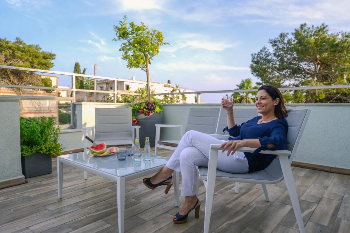 Welcome! This brand new spacious top unit condo lets you live like a home away from home, located in the heart of the north of Israel! 7 minutes drive from the sands of Haifa beach! You can watch the sunset on your private rooftop while swinging in a double size hummock or just getting some sun on the tanning bed. This 3 bedroom & 2 bathroom unit comes with all amenities for the best vacation!