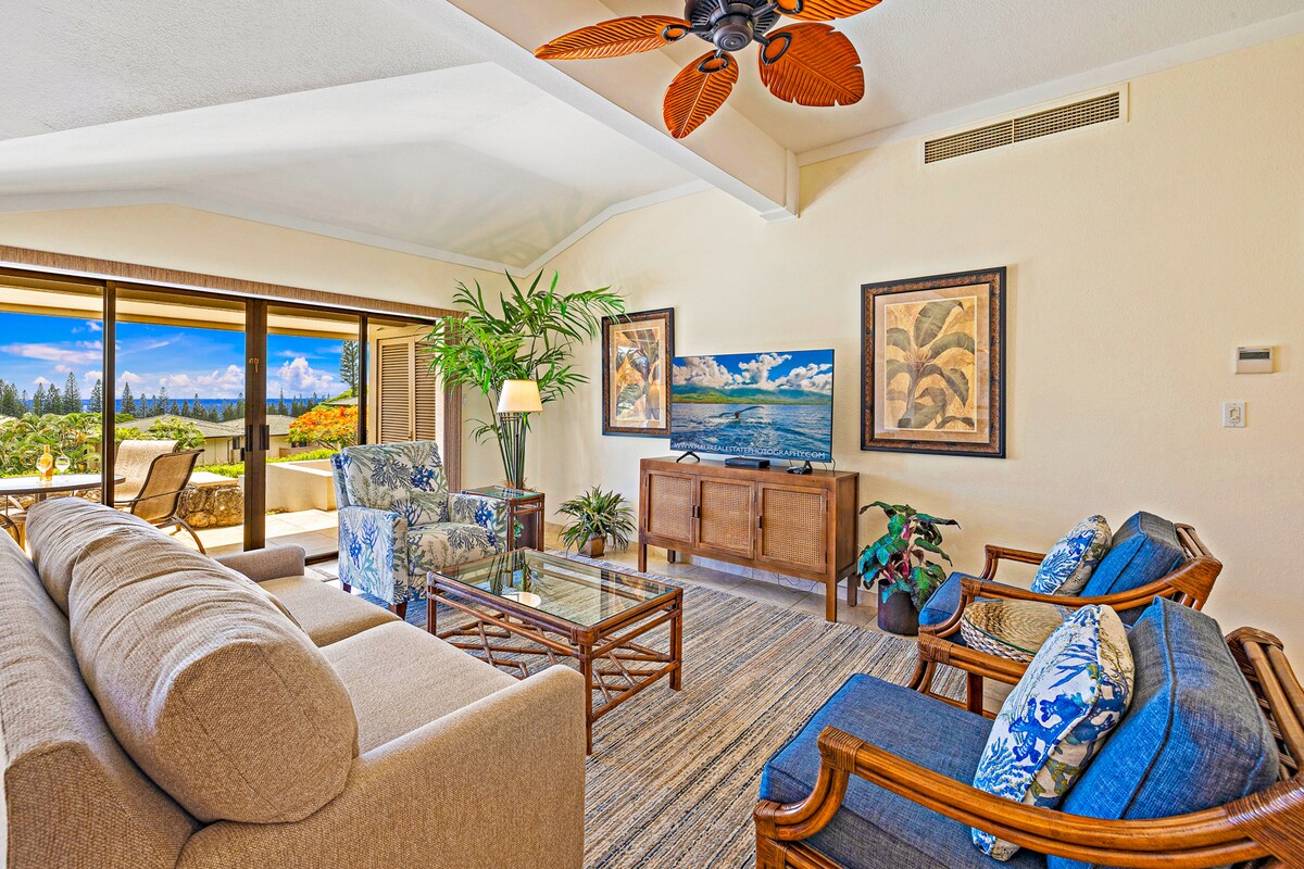 Enjoy amazing, panoramic views in this bright and open island living area connected to an expansive lanai balcony. Great for families with a connected living and entertaining space, but also quiet and private with two bedrooms that each have their very own private patios and dual vanity bathrooms. This is a very flexible space that is ready for the vacation that you want to make of it! Kapalua has world-class beaches, beautiful landscapes, and amazing activities/amenities all around!