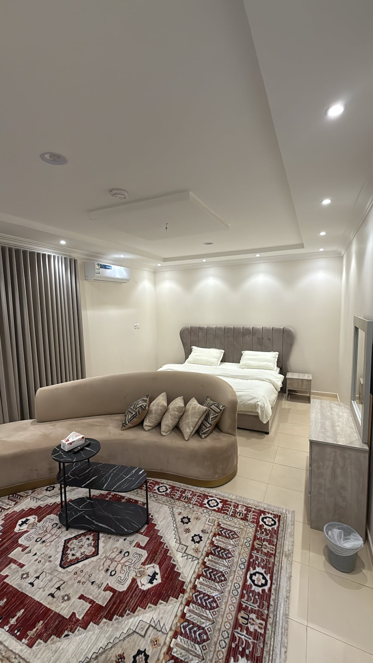 استديو بتصميم فندقي وجميل يجمع بين الراحة والفخامة في مساحة واحدة ويحتوي على تلفزيون 75 بوصه.