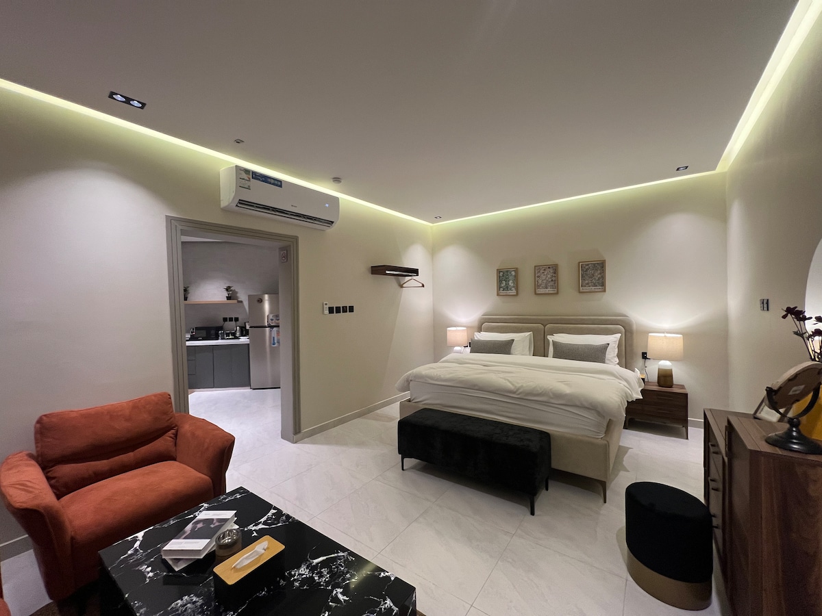 استديو بتصميم فندقي وجميل يجمع بين الراحة والفخامة في مساحة واحدة ويحتوي على تلفزيون 75 بوصه.