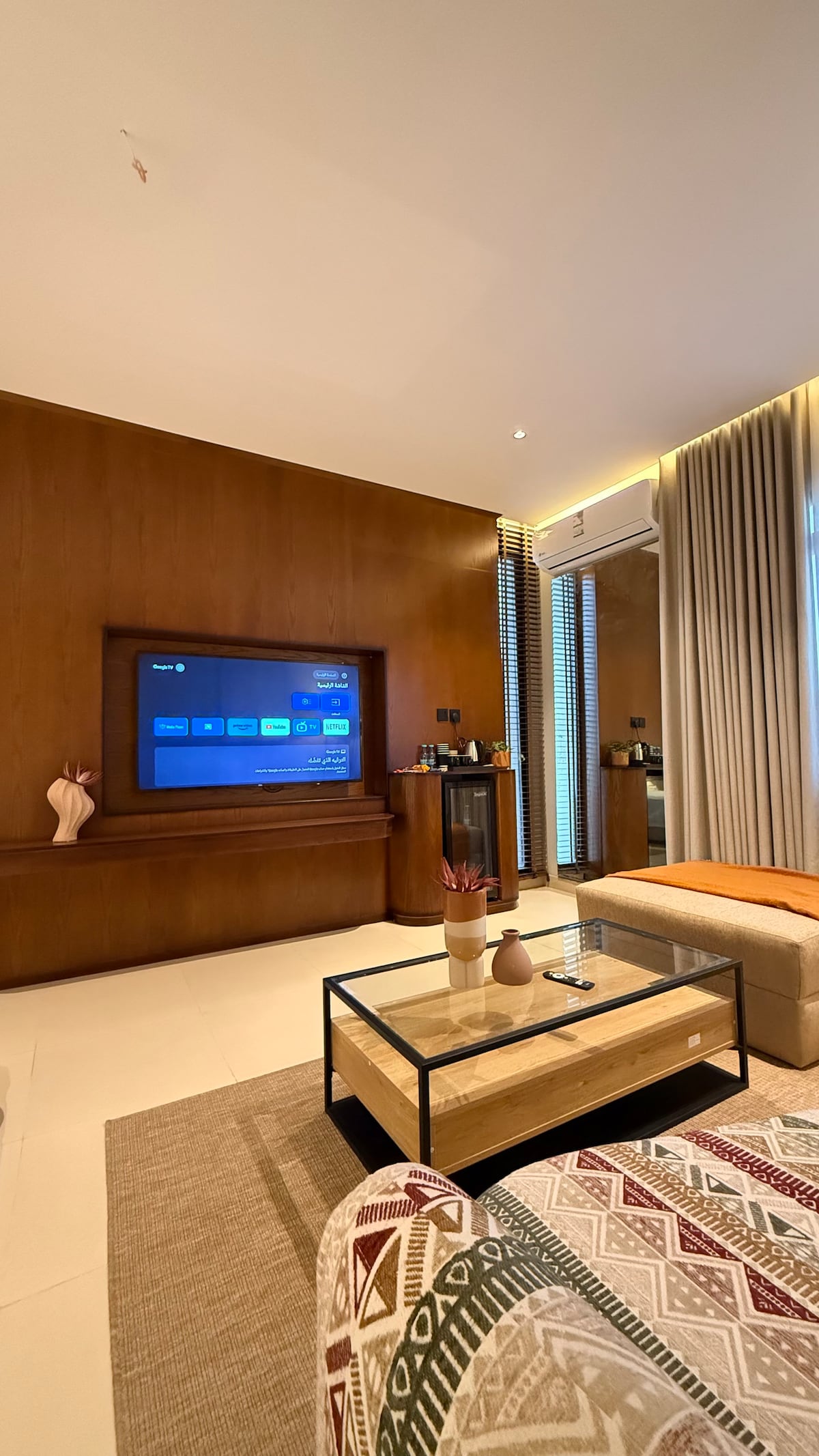 تتميز بغرفة نوم بسرير مزدوج ومريح وتلفاز 55بوصة مع شاهد ونتفلكس وحمام مع جاكوزي وإطلالة كاملة على المدينة وجبال أجاء وتتميز ايضًا بصالة مطلة ايضاً بأطلالة كاملة على المدينة وجبال أجاء مساحتها 30متر وتتكون من أريكة أمريكية تتسع لأربع اشخاص وتشجير طبيعي لوحات تجريدية وتلفاز 65 بوصة مع وجود نتفلكس وشاهد وطاولة طعام تتسع ل4اشخاص ومطبخ صغير ويوجد ثلاجة ومايكرويف وآلة قهوة وشاي وفرن كهربائي