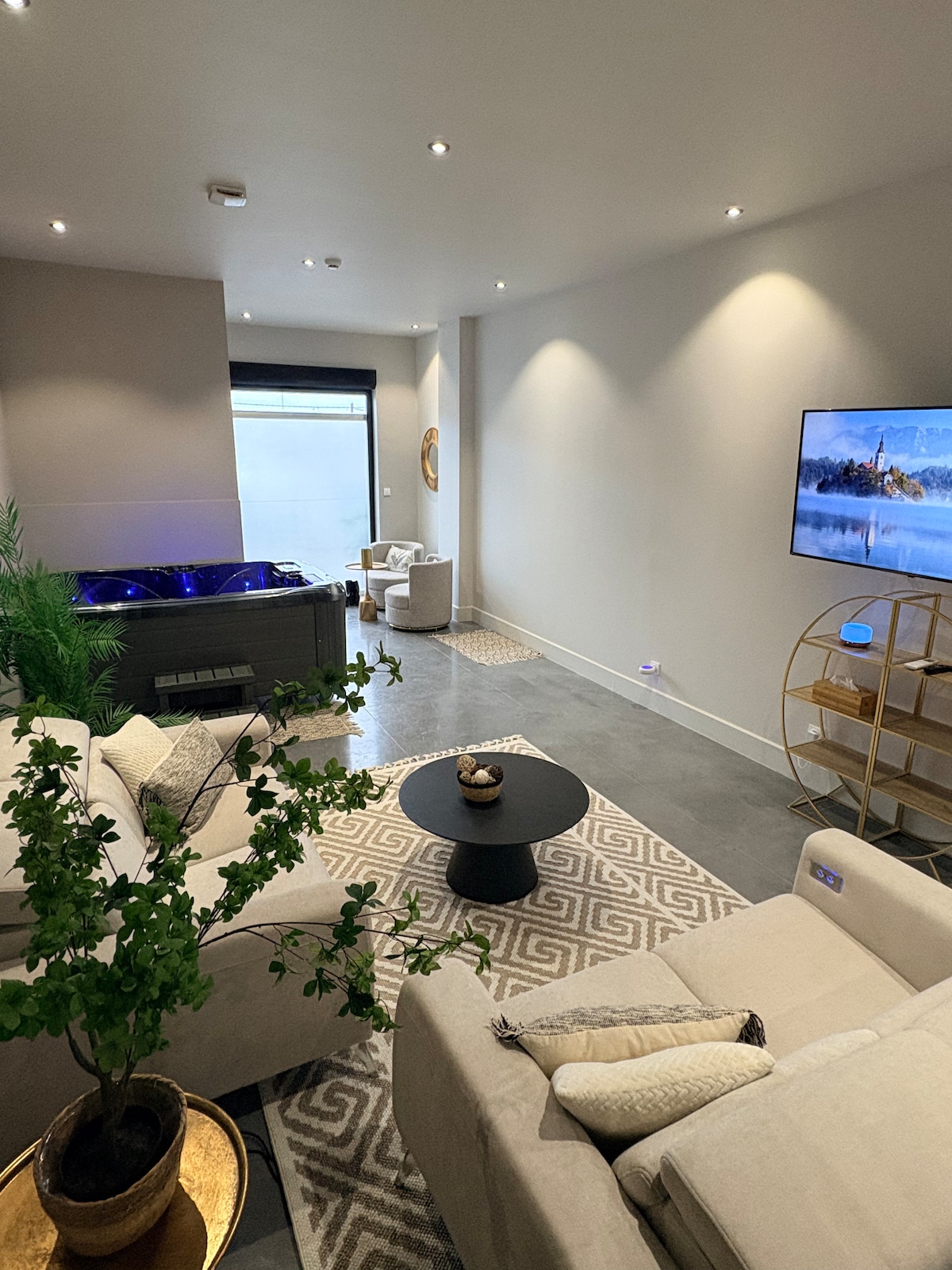 Nous vous offrons de passer un court ou long séjour dans notre gîte à l'ambiance feutrée planté au calme en pleine campagne . De notre terrasse vous observez des arbres remarquables plantes sur une superficie +/- 50 ares. Nous vous proposons salle de bain avec douche à l ' italienne , baignoire balnéo et jacuzzi , une cuisine équipée , et enfin une salle de séjour avec salon et . Voilà +/_ la description de notre cocon . Souhaitons si possible parler français avec nos hôtes.