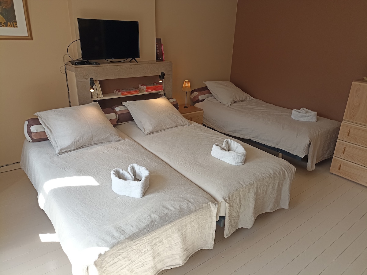 50m² Deluxe Suite with private terrace, King Size bed, living room, Smart TV, elegant bathroom, and fully equipped shared kitchen. Autonomous access, Wi-Fi, and secure private parking. Pool, sauna, breakfast, and bike rental available on request. Located 10 minutes from Villers-la-Ville and 20 minutes from Charleroi airport. Ideal for a comfortable, relaxing, or business stay.