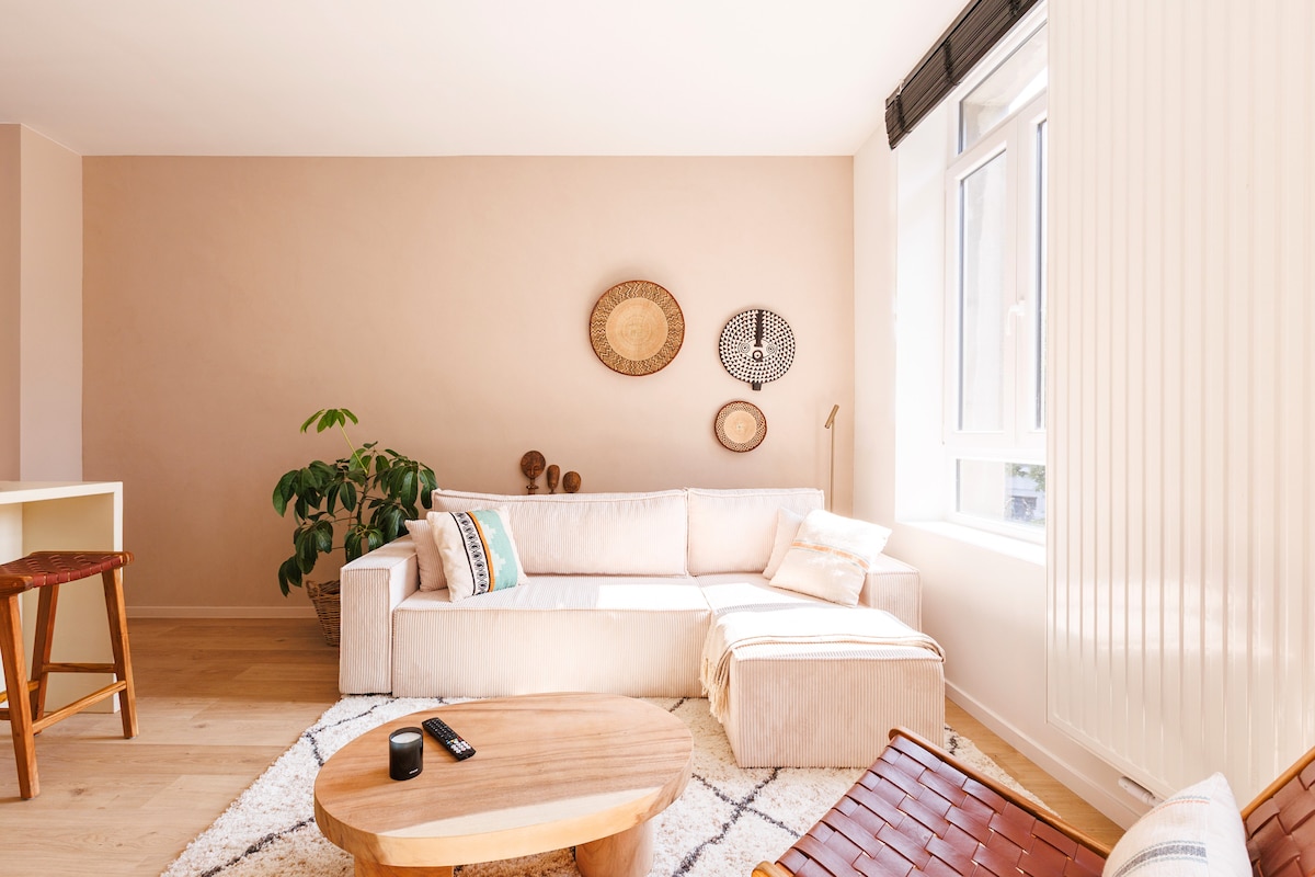 Throw open the terrace doors and let the fresh morning air flow in as you relax on the plush gray sofa, gazing out over the garden. This stylish urban retreat blends modern elegance with character, featuring sleek marble surfaces, contemporary herringbone tiles, and a stunning stained-glass ceiling panel that adds a touch of timeless charm.