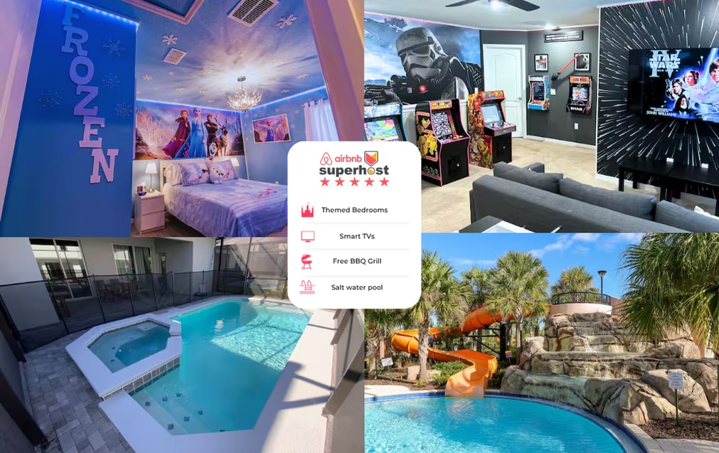 The perfect balance of STYLISH DESIGN, LUXURIOUS COMFORT, & ENDLESS ENTERTAINMENT, beautifully situated with stunning views in the sprawling 3.5 square mile Reunion Resort. You will have your own private pool, spillover spa, STAR WARS cinema-game room with pinball, classic arcade games, and karaoke, MARVEL kids room with tube slide and double bunks, the latest Xbox Series S, a sprawling 2000 ft2 pool deck, fire pit, and even a HARRY POTTER cupboard hidden under the stairs, minutes to Disney.