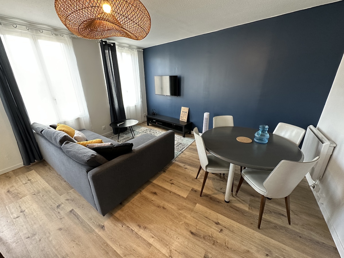 Profitez d'un logement élégant et central. Proximité immediate de toutes commodités, deux boulangeries, à deux pas du marché couvert (mardi, jeudi, samedi), en plein cœur de ville, nous vous accueillons dans notre appartement entièrement rénové. L'appartement est situé á moins de 10 min à pied de la gare Sncf. Pour les voyageurs qui voyagent à deux et souhaitant une parure de lit pour le canapé lit celle ci sera facturée 15€ sur demande.