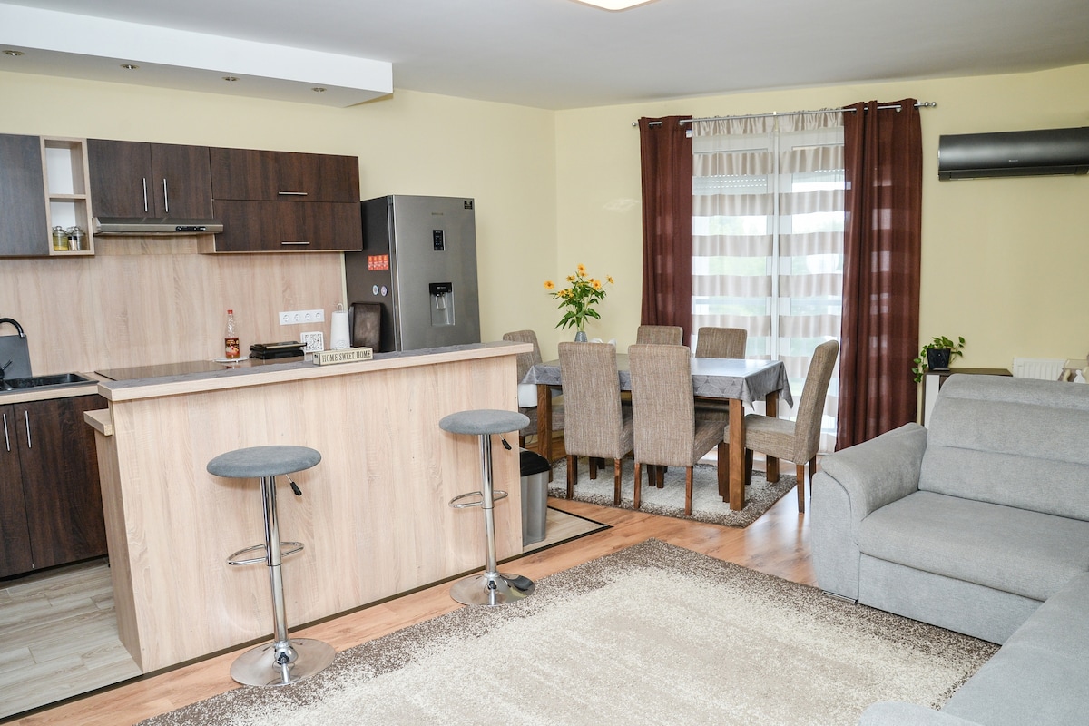 Kétfős apartmanunk ideális választás pároknak, akik nyugodt, kényelmes pihenésre vágynak. A tágas fürdőszoba és a jól felszerelt, nagy konyha tökéletes hátteret nyújt a közös kikapcsolódáshoz. A hangulatos kiülős terasz lehetőséget ad reggeli kávézáshoz vagy esti borozáshoz. A nyugodt környezet és az otthonos berendezés garantálja a kellemes időtöltést minden évszakban.