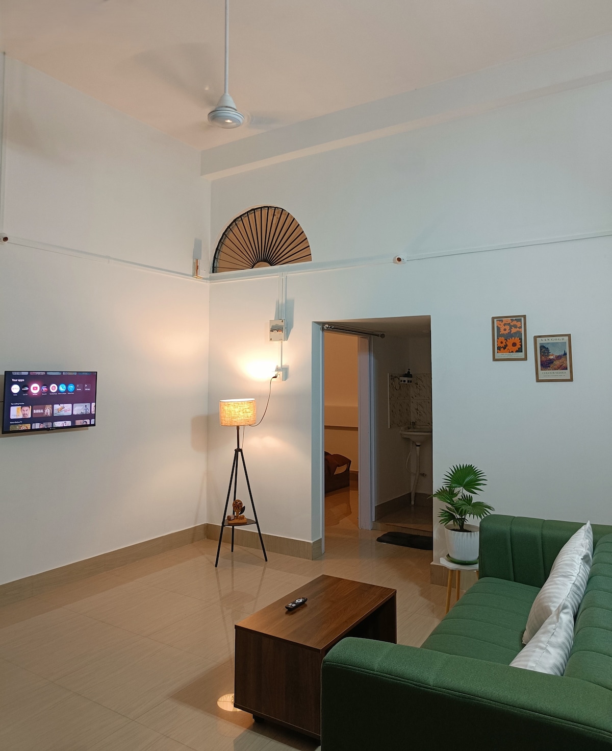 Come for a calm and peaceful stay at this one of a kind living cum bedroom flat attached to a beautiful terrace garden. Since it is an independent terrace flat, you can enjoy all the privacy you want while still having access to people within the premise in case you feel like connecting with them. This sets a perfect balance for anyone who might want to cherish the vibe of both worlds, the comfy, cozy solitude and also the warm, friendly, social interactions with people as per choice.