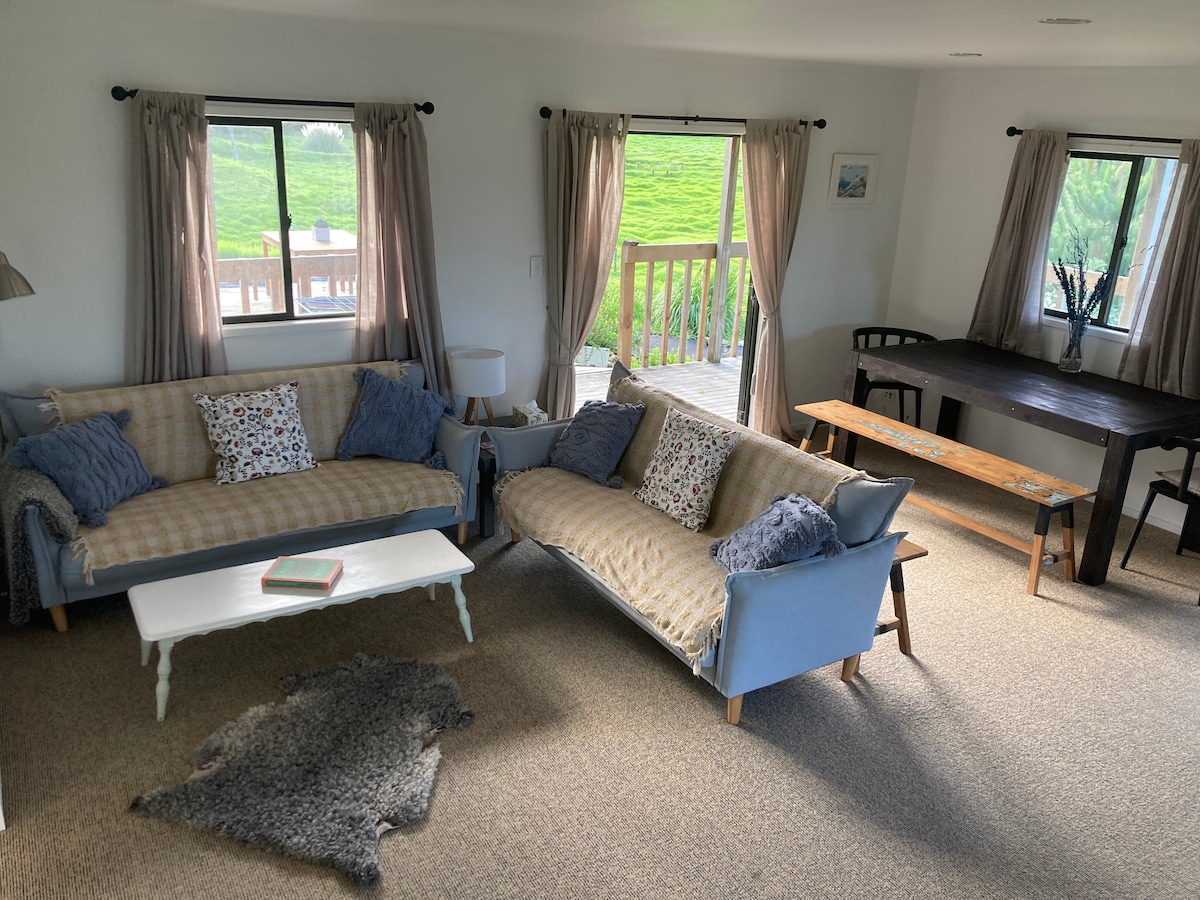 We are 7acre bush block with 300 degree ocean and rural views. Brand new modern house with 4 bedrooms and a separate cabin with a double bed and single bed with stunning views. Comfortable outdoor furniture to make the most of the views, BBQ and spa pool for outdoor living. The house has great Indoor outdoor flow. Heat pump for controlled heating summer and winter. 6 kms to restaurants,shops. Many good surf beaches near bye. Estuary for boating.