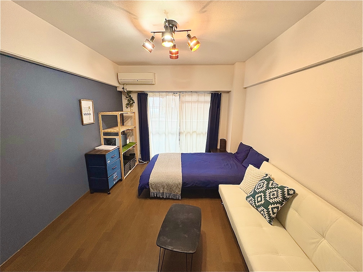 距离福冈「地铁天神站」步行5分钟。改建的公寓房间。1张双人床和1张沙发床。