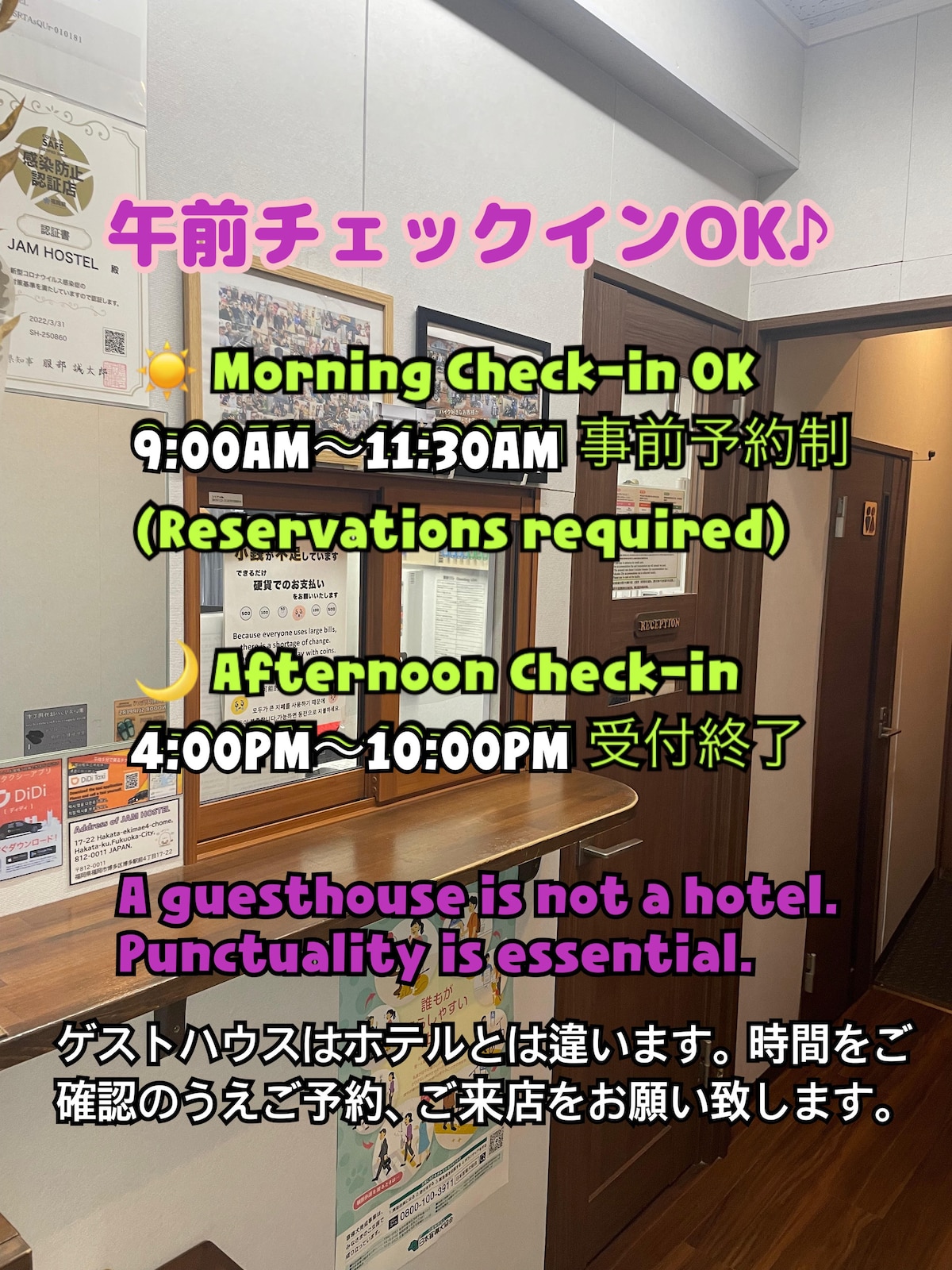 ★Check-in Time★ Morning 9am~12pm (closed) (If you would like to check in in the morning, please contact us the day before.) Afternoon 4pm~10pm (closed) ※There is no staff at the front desk from 12pm~4pm. Therefore, luggage storage and check-in will not be possible during this time. ★Access★ ・From Hakata Station, "Hakata Exit West Exit 24" is the closest exit. ・If you are coming by Shinkansen, the Chikushi Exit is closer. It's about a 7 minute walk along the tracks (under the elevated tracks).