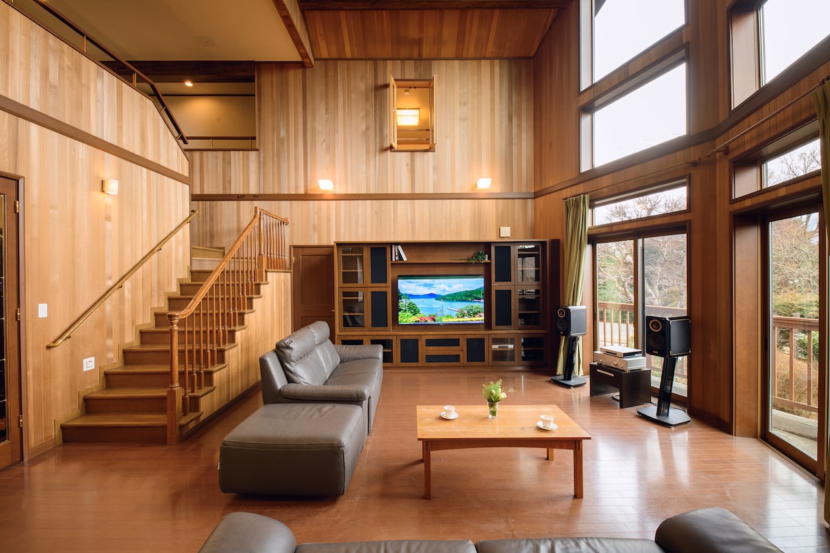 Beautiful 3BDRM holiday villa within Fuji-Hakone-Izu National Park. Comes with a large private hot spring bath, panoramic sea view, projector & garden. Morine provides year-round comfort for relaxation & an ideal base for remote work/holiday. Renovated combining modern Japanese taste with Western comfort. Each bedroom is generously sized & the spacious open-plan kitchen/dining/living area is ideal for getting together. Guests may be greeted by the beautiful blooms of a weeping cherry in spring.