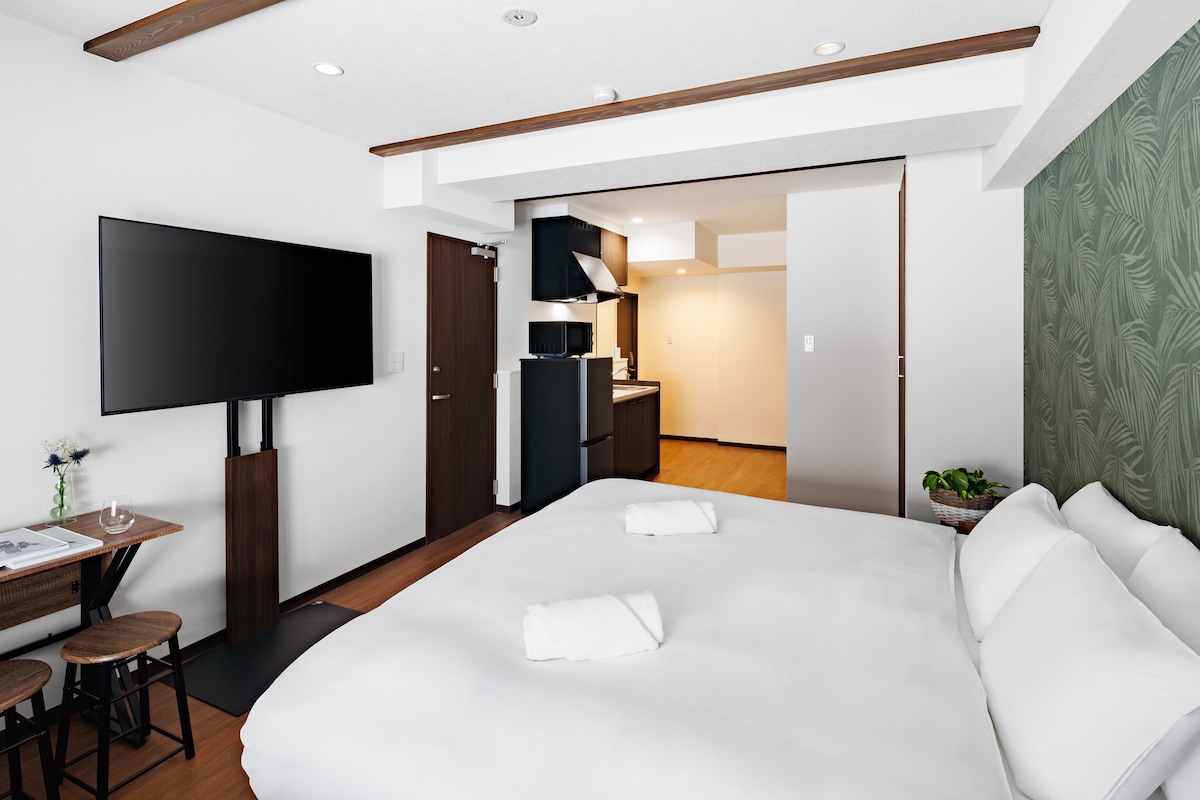 42m2 One Bedroom Suite: Enjoy a stylish experience at the centrally-located Vega Suites by Vega Hakuba GK. Located on 5th Avenue in Echoland, our self contained suites are set in expansive grounds, only one minute walk to the main food & restaurant street of Echoland. Vega Suites are only a 5 min drive from the world famous Happo mountain resort and a 10 min drive to Goryu, Hakuba 47 or Iwatake. Enjoy our signature 5 star hotel grade mattresses or relax in our in-house lounge bar (in winter).