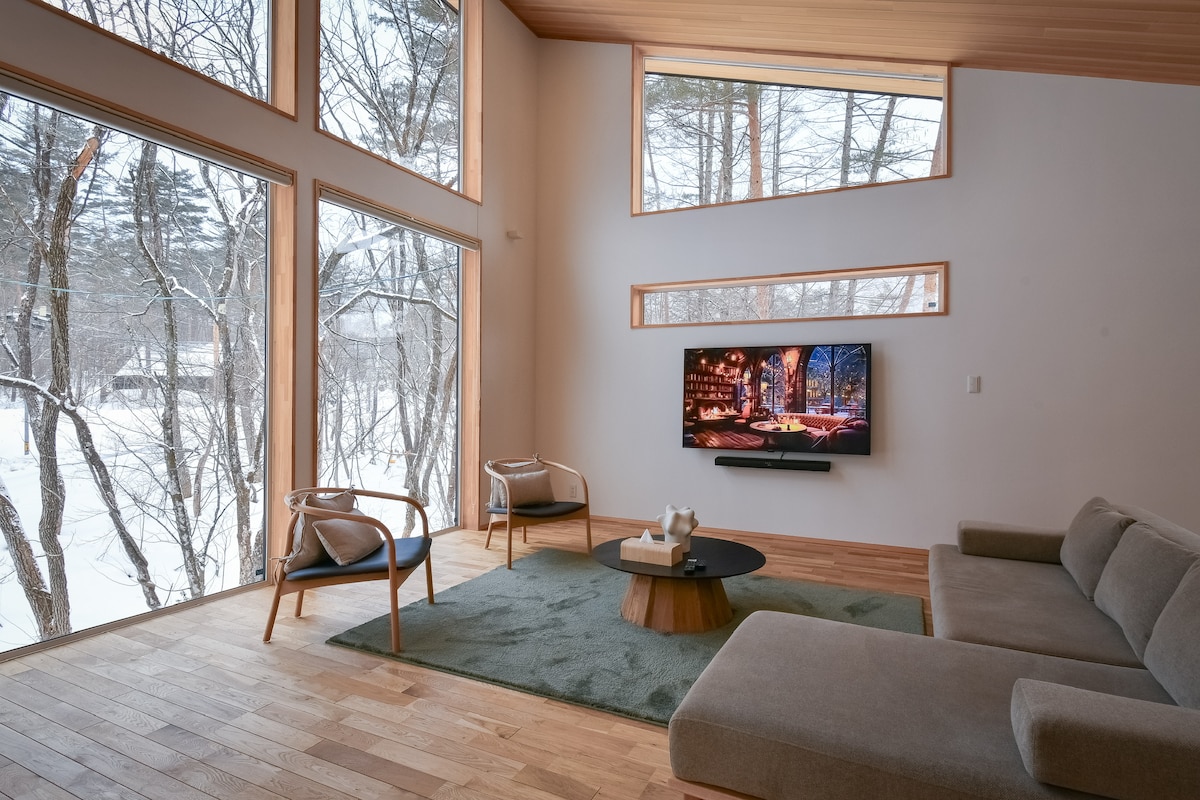 Located in Wadano woods with a breathtaking view overlooking the Happo Resort slopes, it is a beautifully designed timber-framed house. A perfect location overlooking the slopes of Happo Resort. Nestled in a quiet forest, this stylish villa offers a million-dollar view from the wide windows. Guests can enjoy the pleasure of looking out at the ski slopes while taking a relaxing bath. Spend a luxurious vacation at Fuku Chalet with an unforgettable view!