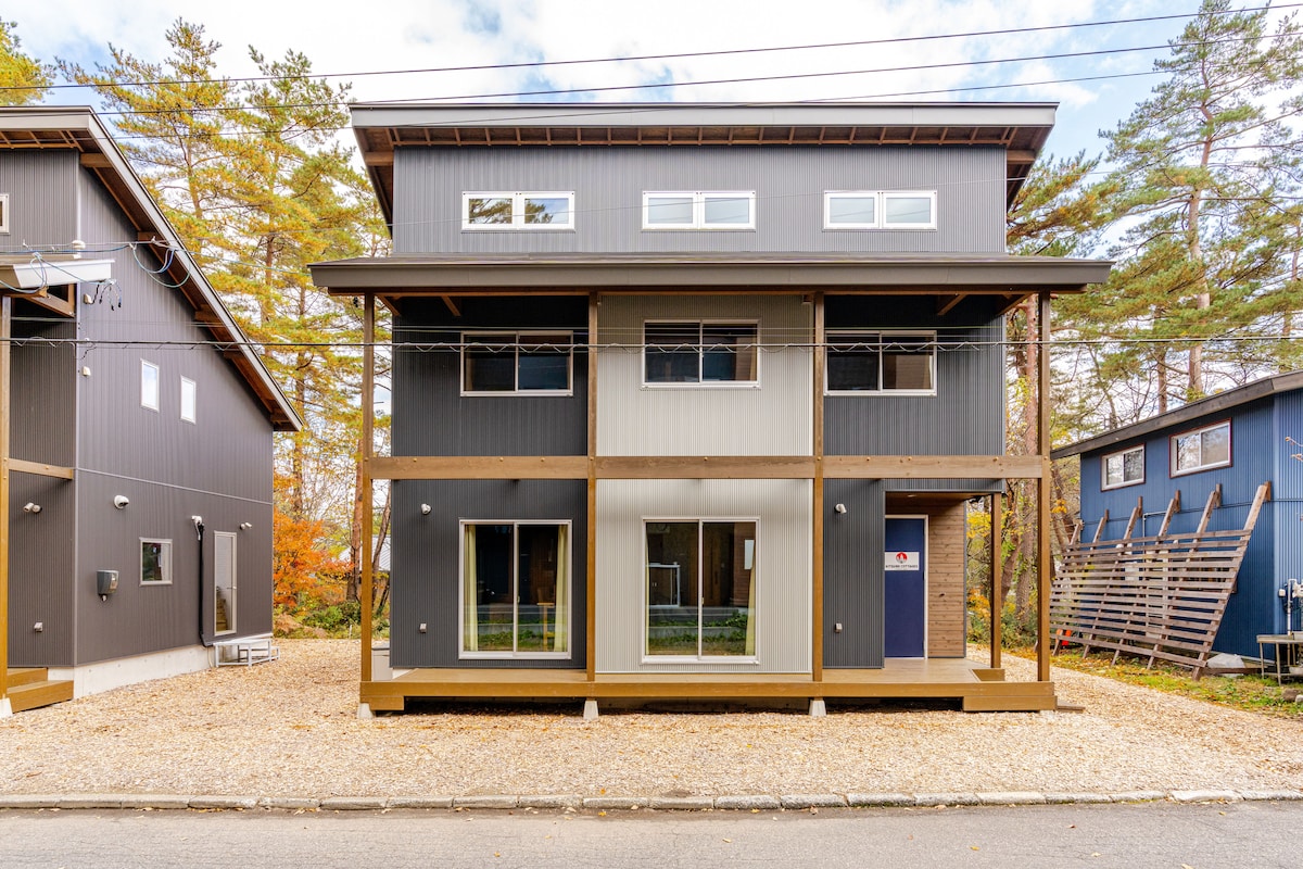 Kitsune Cottage BLUE is a beautiful self-contained unit, built in the fall of 2016. At just under 100 square meters of functional space, the unit was designed by Hakuba Powder Lodge co-owner Hiroko Kowal. This cottage features a functional modern kitchen in a wide open living room area with a large dining table, sofa and TV. Upstairs you will find 3 bedrooms with space for up to 6 guests. Located in the heart of Echoland Hakuba’s main après ski and dining area.