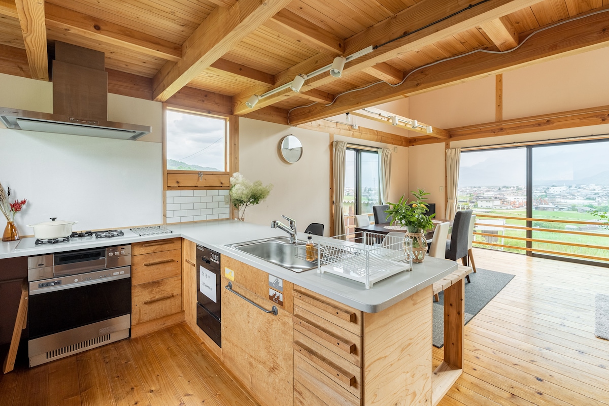 白馬まで車で30分、上高地や立山黒部アルペンルート観光に便利な一棟貸切の宿です。 広々4LDKでファミリーや落ち着いた大人のグループに最適。 お庭でBBQも楽しめ、静かでプライベートな滞在をお約束します。 ◻︎ 田畑に囲まれた壮大な敷地に建つ、開放感あふれる一棟貸切の宿です。 木のぬくもりが心地よく、窓の外には四季折々の美しい景色が広がり、心を解きほぐしてくれます。 住宅は高台に建ち、眼下には市街地や田園風景が広がり、その先には北アルプスの絶景が一望できます。 朝昼夜で表情を変える雄大な景色を眺めながら、非日常のひとときをお過ごしください。 ここは、ただ「泊まる」だけの場所ではありません。 日常を忘れさせてくれる開放的な空間、静寂に包まれた自然の中で深呼吸する贅沢な時間――心と体をリフレッシュできる特別な滞在をお約束します。 まるでご自分の別荘のようにゆったりと過ごし、心からリフレッシュするひとときをお楽しみください。 ※大音量での音楽やにぎやかなパーティ目的のご利用はご遠慮ください。 ◻︎